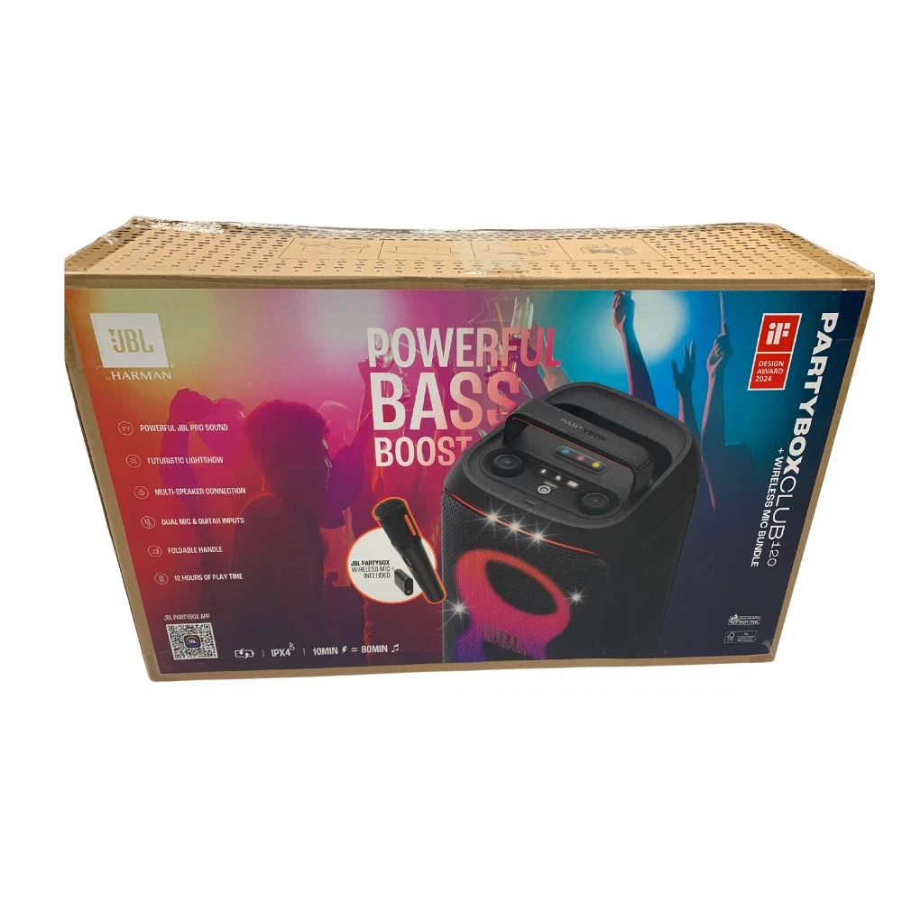 Condition: Open box – No scratches, dents, or stains. Looks and performs like new! Fully tested and working perfectly. 📦 What’s Included: JBL PartyBox Club 120 Speaker JBL Wireless Microphone Microphone Receiver AC Power Cord Black Protective Carry Bag Product Highlights ✅ Powerful JBL Pro Sound 160W of room-filling audio with rich bass and clear highs. Perfect for indoor parties or outdoor gatherings. ✅ Futuristic Lightshow Built-in dynamic light display syncs to your music. Fully customizable via the JBL PartyBox app. ✅ Portable & Splash-Resistant Take the party anywhere. The speaker is splash-proof (IPX4), and the foldable ergonomic handle with even weight distribution makes carrying easy. ✅ Up to 12 Hours of Battery Life Keep the music going all day or night. Plus, get 80 minutes of playtime from just a 10-minute fast charge when you’re in a rush. ✅ Dual Mic & Guitar Inputs Host karaoke sessions or plug in a guitar for live performances—two mic inputs and guitar input available. ✅ Multi-Speaker Connectivity via Auracast™ Pair two PartyBox Club 120s for stereo sound or connect multiple speakers for an epic soundstage. ✅ JBL PartyBox App Control Adjust EQ, control playback, and customize the lightshow—all from your phone. ✅ Eco-Conscious Design Partly made with post-consumer recycled plastic and packaged in FSC-certified paper using soy ink. 🎉 Why Buy This One? Like-new open box item – save money without sacrificing quality Comes with premium extras : mic, receiver, and protective bag Perfect for parties, events, karaoke nights, or just jamming out at home Fast shipping & trusted seller 💬 Message me if you have any questions! 📦 Ships securely with care. We don't ship it to PO Box. Thank you.