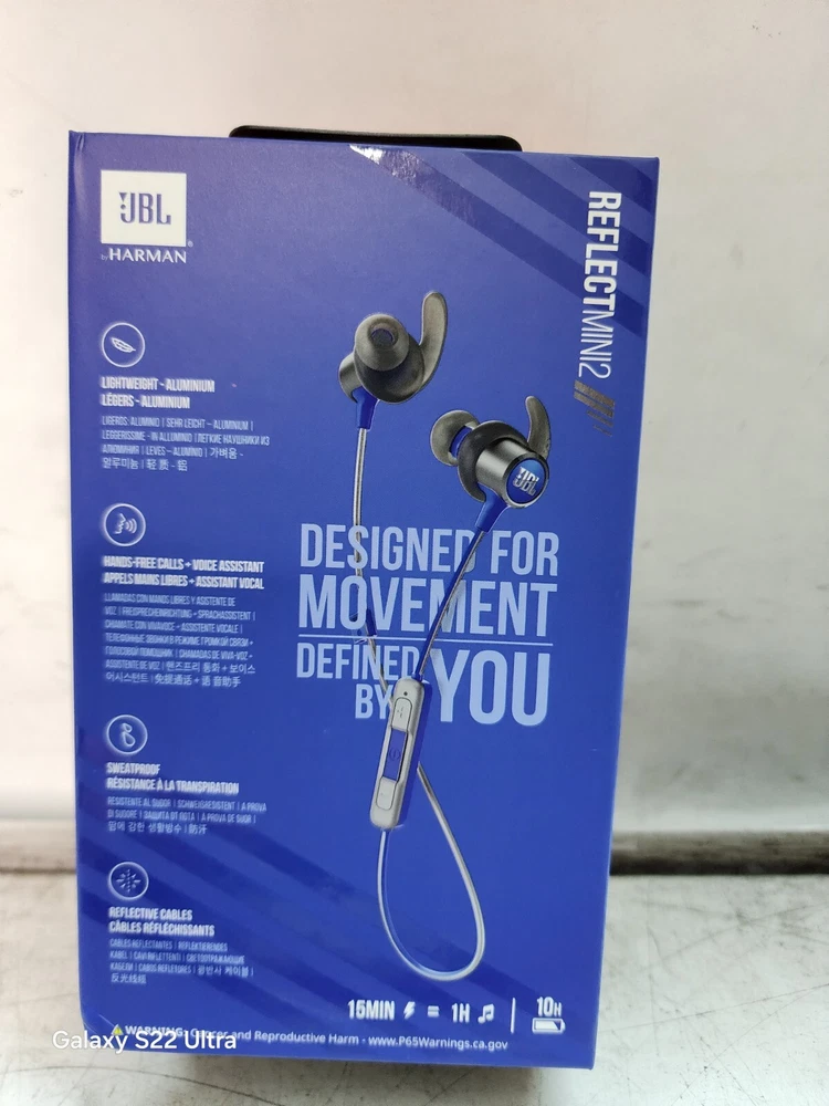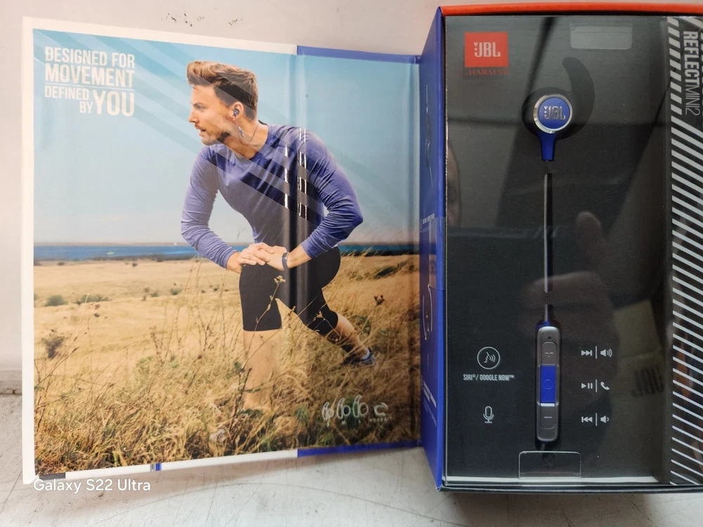 The JBL Reflect Mini 2 Bluetooth Earphones in Blue are in-ear wireless earbuds with a double earpiece design. They feature Bluetooth connectivity and have a sleek and portable form factor. These earphones are part of the JBL brand and are ideal for those seeking a wireless audio experience with a sporty touch.