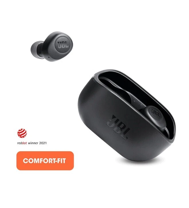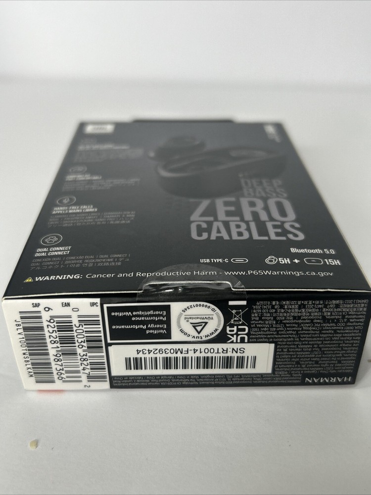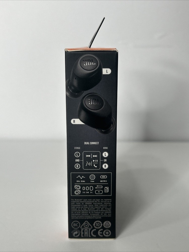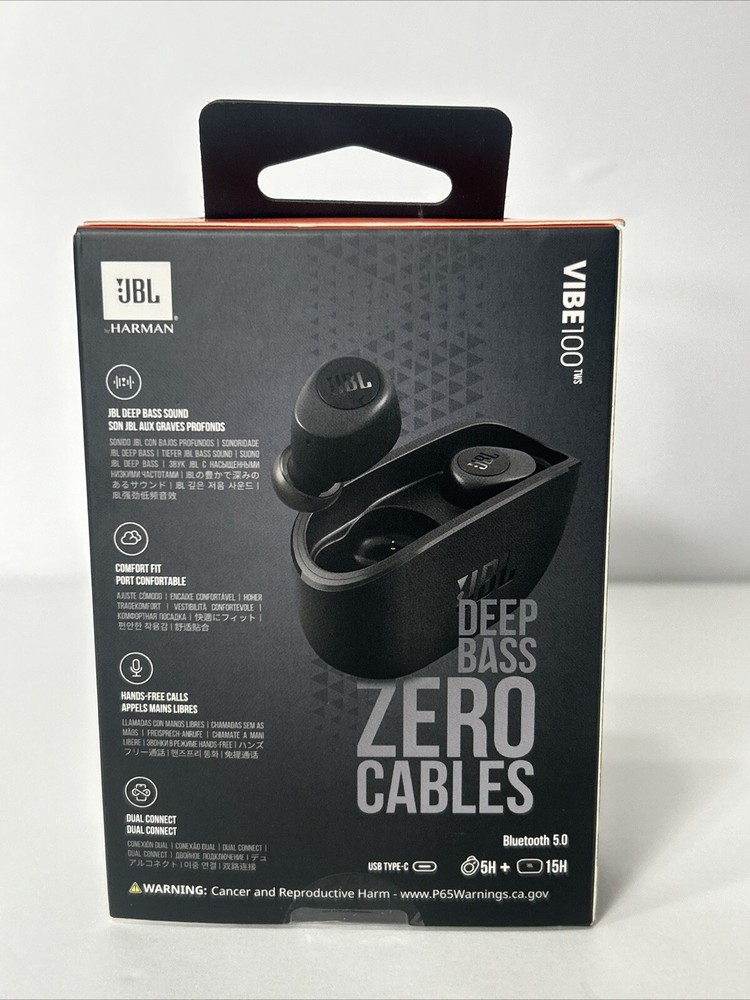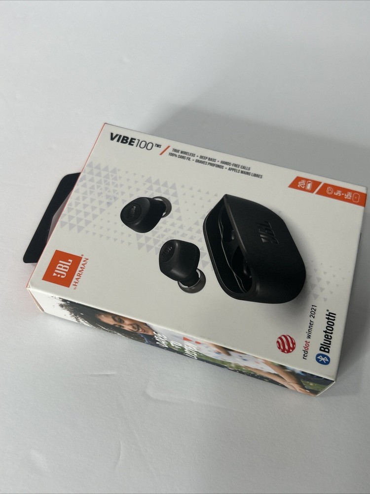 These are JBL Vibe 100 TWS Black True Wireless Earbud In-Ear Headphones. They have a built-in microphone, Bluetooth connectivity, and a double earpiece design. The headphones are brand new and sealed, with a sleek black color. The impedance is 16 ohms, and they were manufactured in the 2020s.