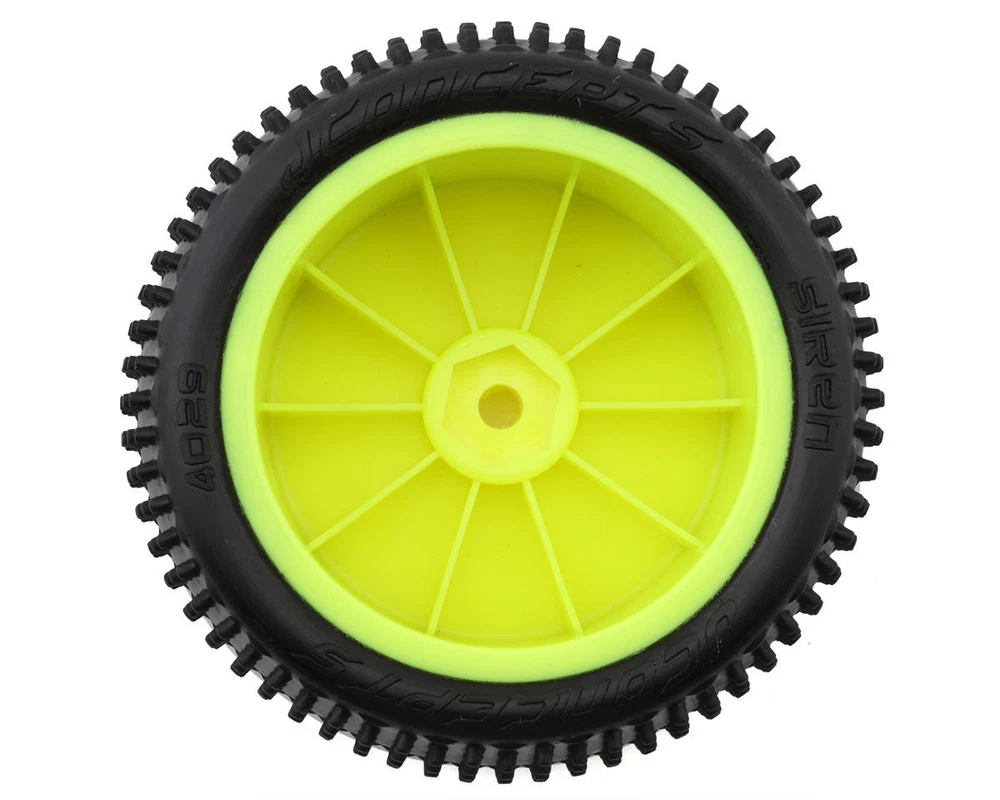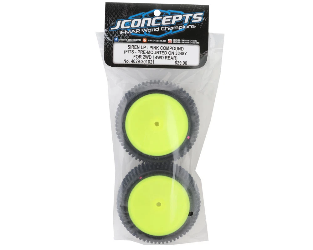 Tires Overview: The JConcepts Siren LP Carpet 2.2" Rear Buggy Tires take some styling cues from the JConcepts Nessi, with some key improvements. This tire brings a larger, and taller, sized 3D blended pin-size, pin-separation on a lightweight, low-profile carcass. Made to mount on 2.2" rear buggy wheels, these tires can prove to be a key element in taking you to the finish line! The Siren tire is designed to be extremely versatile and work well with carpet and AstroTurf. The semi-circle protrusions, unique to the Lockness, Nessi, and now the Siren are included in the center section of the tire and on the sidewall area. These details are important, and the low semi-circles improve side-bite but also minimize grip-rolling instances associated with normal pins. Features: Factory pre-mounted on genuine JCO3348 wheels JConcepts fit, finish and design 3D blended, taller height pin-size for deep digging Semi-circle protrusions for side-bite Low-profile, wide stance carcass Incredibly low-profile carcass for rolling speed Includes: (2) Siren LP Pre-Mounted 2WD/4WD Buggy Rear Tires About Us | View Store
