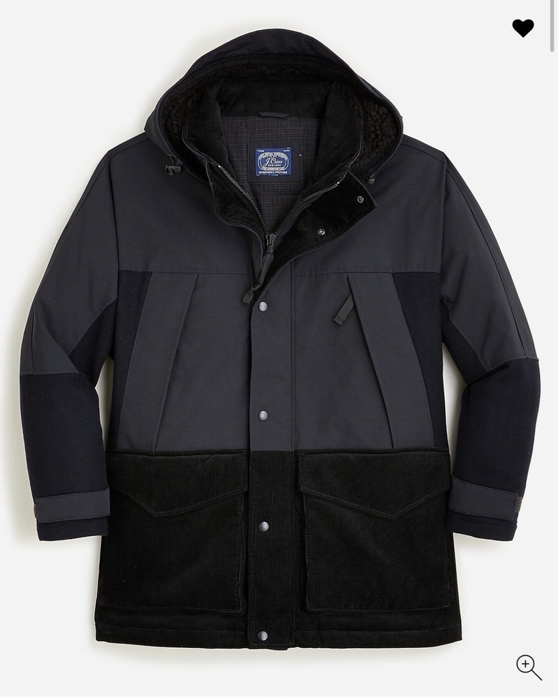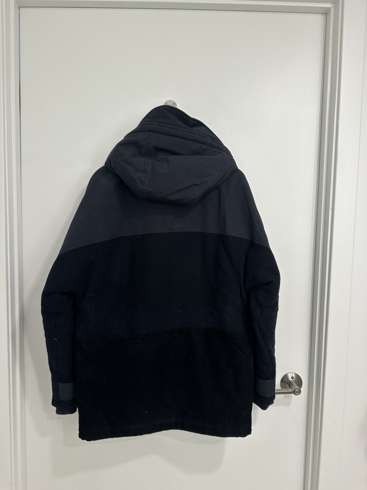 Has some light marks on the upper shell and some lint on the material but in good condition Upper shell: 84% polyester/16% cotton. Lower shell: 100% cotton. Sleeves: 80% wool/20% polyamide. Button closure with hidden zip.