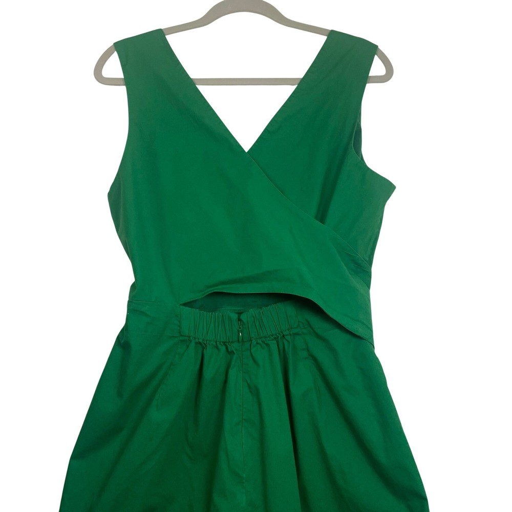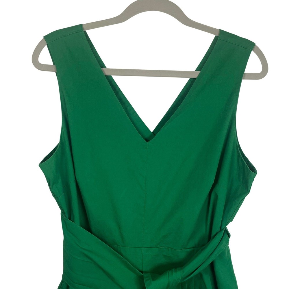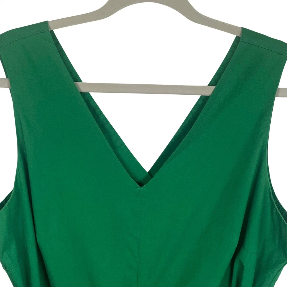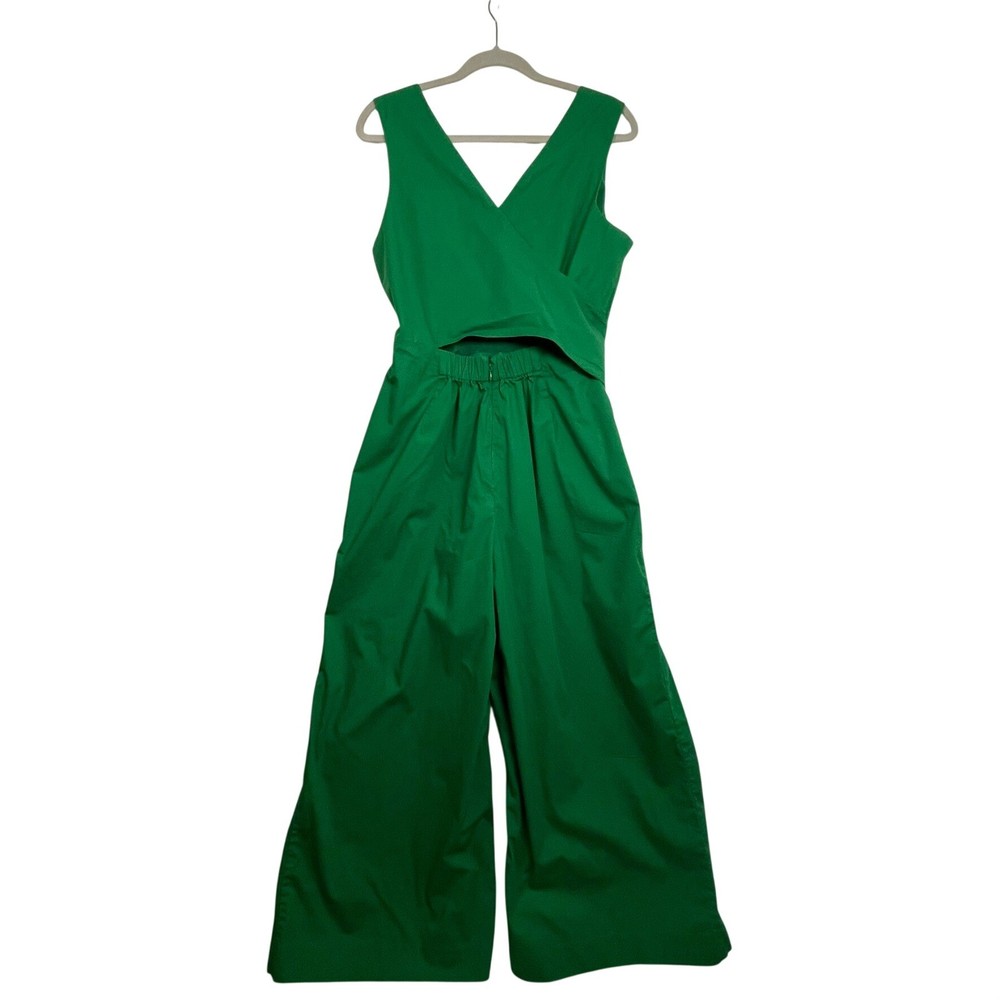 Vibrant green jumpsuit offers a sophisticated silhouette with its wide-leg design and flattering V-neckline. Crafted from a comfortable cotton blend with a hint of stretch, it features a wrap-style back with a subtle cutout detail and a matching self-tie belt to define the waist. Functional side pockets add practicality to this chic one-piece, while the elasticized back waist and hidden zipper ensure a secure fit. Great for a spring outfit or a sophisticated St. Patrick's Day outfit. Brand: J.Crew Type: Jumpsuit Style: Wide Leg, Cutout Back Color: Green Material: 98% Cotton, 2% Elastane Lining: 94% Polyester, 6% Elastane Neckline: V-Neck Sleeve: Sleeveless Closure: Zip, Tie Features: Pockets, Elastic Waist Occasion: Casual, Party/Cocktail Country of Manufacture: India Measurements: • Bust: 19" (38" doubled) • Waist: 19.5" (39" doubled) • Hip: 24" (48" doubled) • Thigh: 15" (30" doubled) • Full Length: 52"