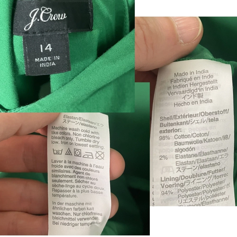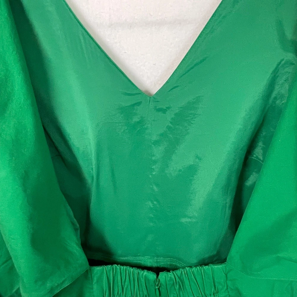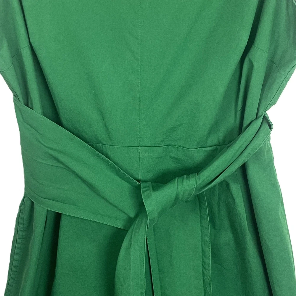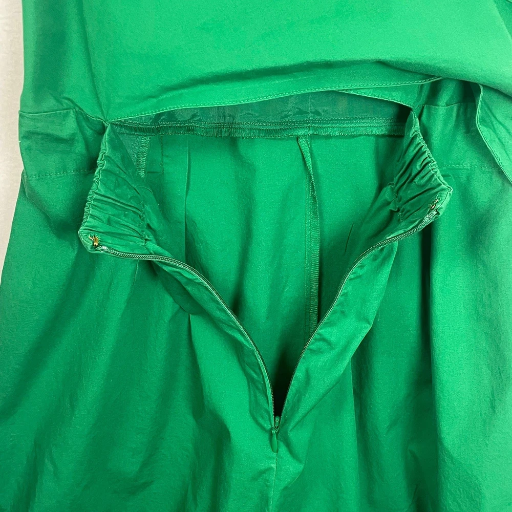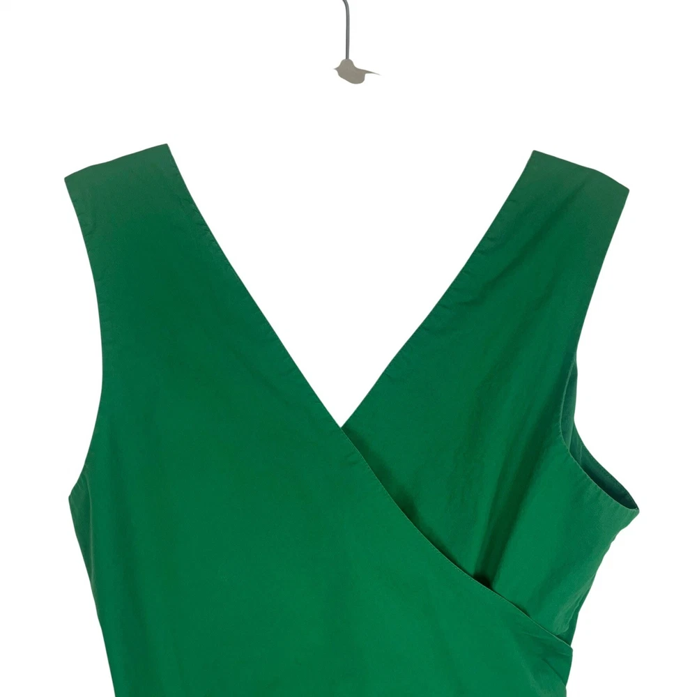 Vibrant green jumpsuit offers a sophisticated silhouette with its wide-leg design and flattering V-neckline. Crafted from a comfortable cotton blend with a hint of stretch, it features a wrap-style back with a subtle cutout detail and a matching self-tie belt to define the waist. Functional side pockets add practicality to this chic one-piece, while the elasticized back waist and hidden zipper ensure a secure fit. Great for a spring outfit or a sophisticated St. Patrick's Day outfit. Brand: J.Crew Type: Jumpsuit Style: Wide Leg, Cutout Back Color: Green Material: 98% Cotton, 2% Elastane Lining: 94% Polyester, 6% Elastane Neckline: V-Neck Sleeve: Sleeveless Closure: Zip, Tie Features: Pockets, Elastic Waist Occasion: Casual, Party/Cocktail Country of Manufacture: India Measurements: • Bust: 19" (38" doubled) • Waist: 19.5" (39" doubled) • Hip: 24" (48" doubled) • Thigh: 15" (30" doubled) • Full Length: 52"
