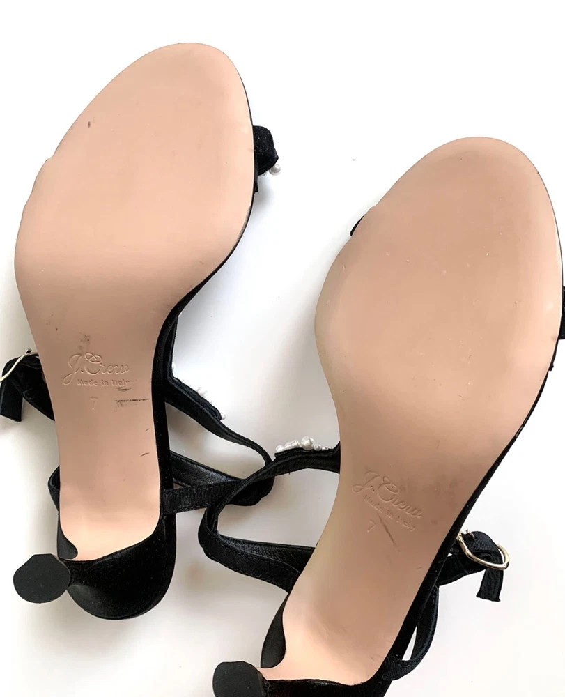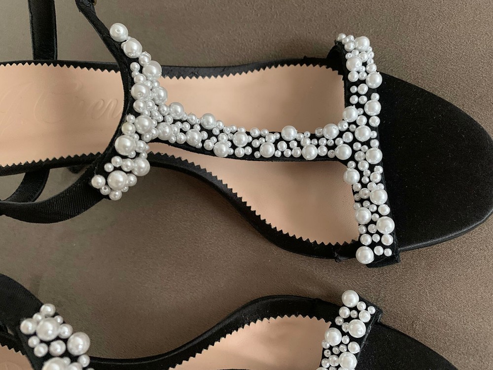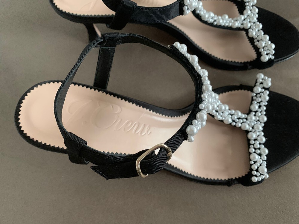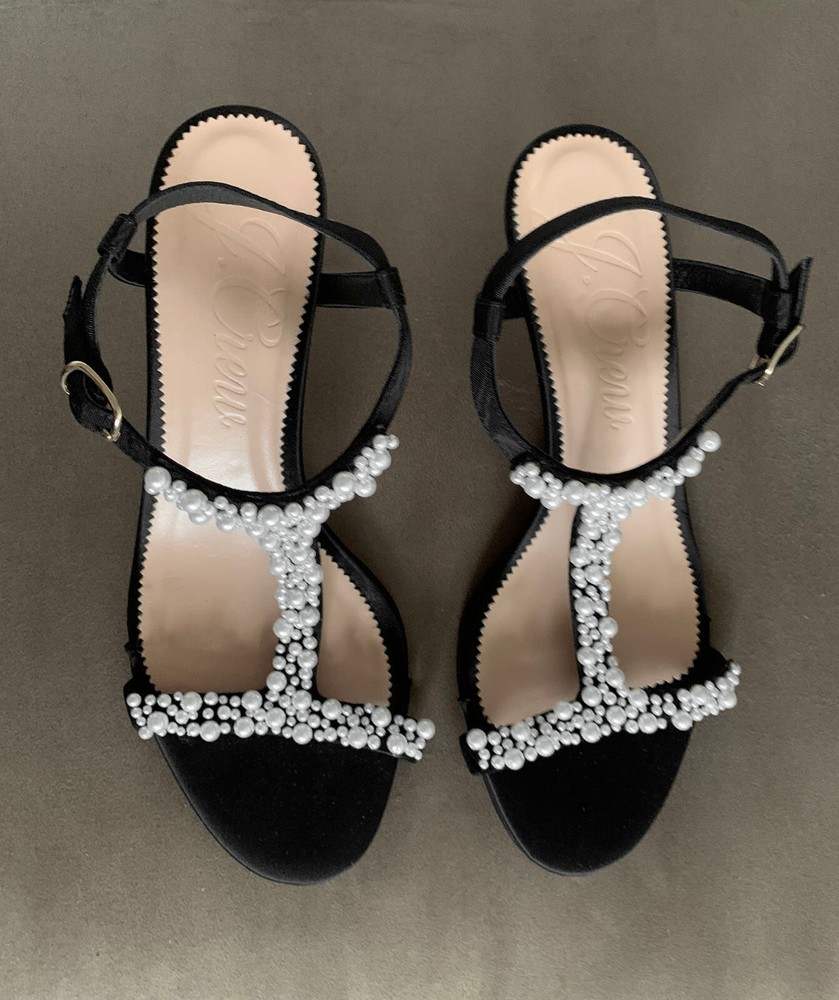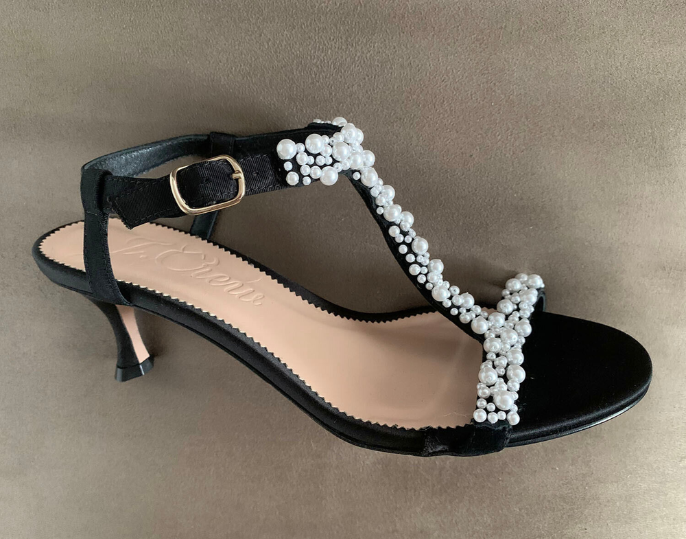 J. Crew Pearl T-strap heels Fabric Upper, leather lining, pearl detailing Buckle closure Heel approximately 2 3/4" Made in Italy