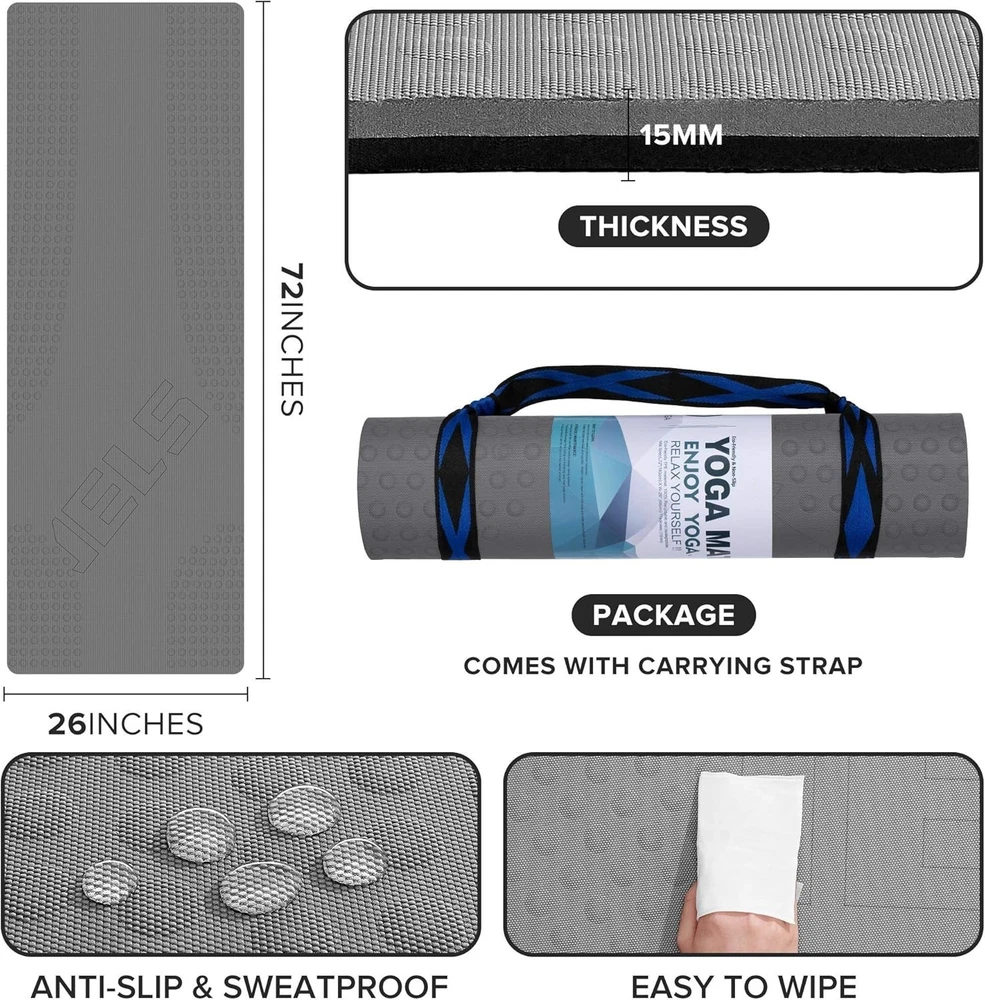 JELS 3D Non-Slip Yoga Mat - 72"x26", Perfect for Yoga, Pilates, & Home Workouts ‹ › ‹ › ‹ › ‹ › ‹ › ‹ › ‹ › JELS 3D Non-Slip Yoga Mat - Perfect for Yoga, Pilates, & Home Workouts Features: Extra Thick Exercise Mat (2/5 inch or 10MM) for superior cushioning and comfort. Non-Slip on Double Sides with 369 cushioning anti-slip modules for strong friction. Made from PVC-Free material, SGS certified for safe use by the whole family. Extra-large size: 72 inches x 26 inches - designed specifically for your workout needs. Free carry strap included for easy transport to the gym or anywhere you go. Benefits: Extra thickness offers increased support, protecting your joints during practice. Exceptional grip, ensuring stability even during the most vigorous workouts. Durable, non-toxic, and tear-resistant, making it suitable for long-term use. Large size accommodates all movements, providing peace of mind during your practice. With a focus on quality and practical performance, this mat enhances every workout experience. Why choose the JELS Non-Slip Yoga Mat? If you're seeking a yoga mat that merges comfort, safety, and durability, look no further than the JELS 3D Non-Slip Yoga Mat. Measuring a spacious 72 inches in length and 26 inches in width, it's specially designed to meet the needs of modern yogis and fitness enthusiasts alike. The 10MM thickness offers unprecedented cushioning, while the double-sided non-slip surface guarantees stability even during sweaty sessions. Crafted from eco-friendly, PVC-free material, you can practice with confidence knowing you have made a safe choice for your family and the environment. Whether at home, in the studio, or outdoors, this mat is your perfect exercise partner. Transform your workout routine and elevate your practice with the JELS 3D Non-Slip Yoga Mat—order yours today! Shipping Free & Fast Shipping - We offer free shipping to most of the USA with a normal delivery time of 3-7 days. However, due to the current situation, additional delivery time (up to 3 weeks) may be required for some items. Alternative Carriers - We may use alternative carriers (e.g. USPS, FedEx, UPS, etc.) to ensure your package arrives safely and on time. Due to the use of multiple carriers, we are unable to provide a tracking number automatically. Handling Time - Orders are processed and shipped within 1-2 business days of receiving cleared payment. Shipping Restrictions - Shipping to Alaska, Hawaii, Puerto Rico, Guam, and other US territories may incur shipping charges or delivery restrictions. Please contact us before ordering, or your order can be refunded/cancelled. State Restrictions - There may be restrictions based on your state of purchase. For example, certain items may not be shipped to California due to state regulations. Contact for Tracking Updates - If you require tracking updates or have any concerns about the delivery of your order, please feel free to contact us, and we will be happy to assist you. Return 30-Day Hassle-Free Returns - We want you to be completely satisfied with your purchase. If you are not, you can return the item within 30 days of receiving it for a full refund or exchange. Easy Return Process - To start a return, simply contact us and we will provide you with a prepaid return shipping label and detailed instructions. Restocking Fee - There are no restocking fees for returns. However, the buyer is responsible for return shipping costs if the return is not due to a seller's error. Refund Processing Time - Refunds will be processed within 5 business days of receiving the returned item in its condition. Payment We accept all major credit cards, PayPal, and Apple Pay for your convenience. Your payment information is secure and encrypted to ensure a safe and seamless transaction. Please complete your payment within 3 days of purchase to avoid any delays in shipping. Feedback Your feedback is extremely important to us. We strive to provide the best products and customer service possible. If you are satisfied with your purchase, please take a moment to leave us a positive review. If you have any concerns or issues with your order, please contact us before leaving negative feedback. We are committed to resolving any problems and ensuring your satisfaction. Contact Us If you have any questions or concerns, please feel free to out to our customer support team. You can contact us through the eBay messaging system. We are available Monday to Friday, 9:00 am to 5:00 pm EST, and we will do our best to respond to your inquiry within 24 hours. Buy it now and enjoy a pleasant shopping experience! Size: 72"x26" Item Weight: 2.3 pounds Shape: Rectangular Unit Quantity: 1 Sport/Activity: Yoga,Pilates,Floor Workout,Gymnastics Material: TPE,Thermoplastic Elastomers Features: Non-Slip,Ergonomic Design,Extra Thick,Anti-Slip,Durable,Tear-Resistant,Carrying Strap,Cushioned,Moisture Wicking Care Instructions: js-tpe15mm-g/b Type: Yoga Mat Color: Gray Number of Items in Set: 1