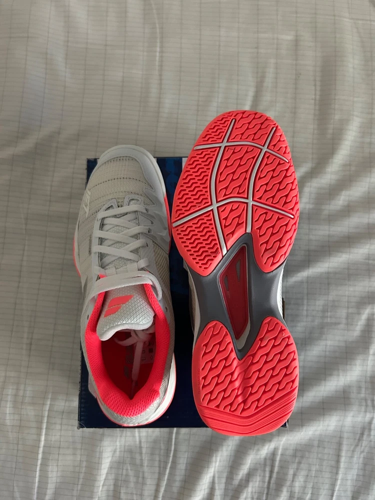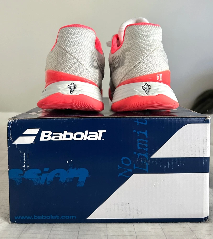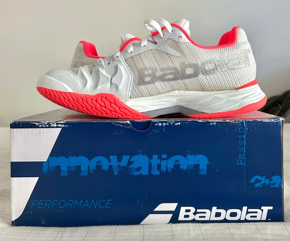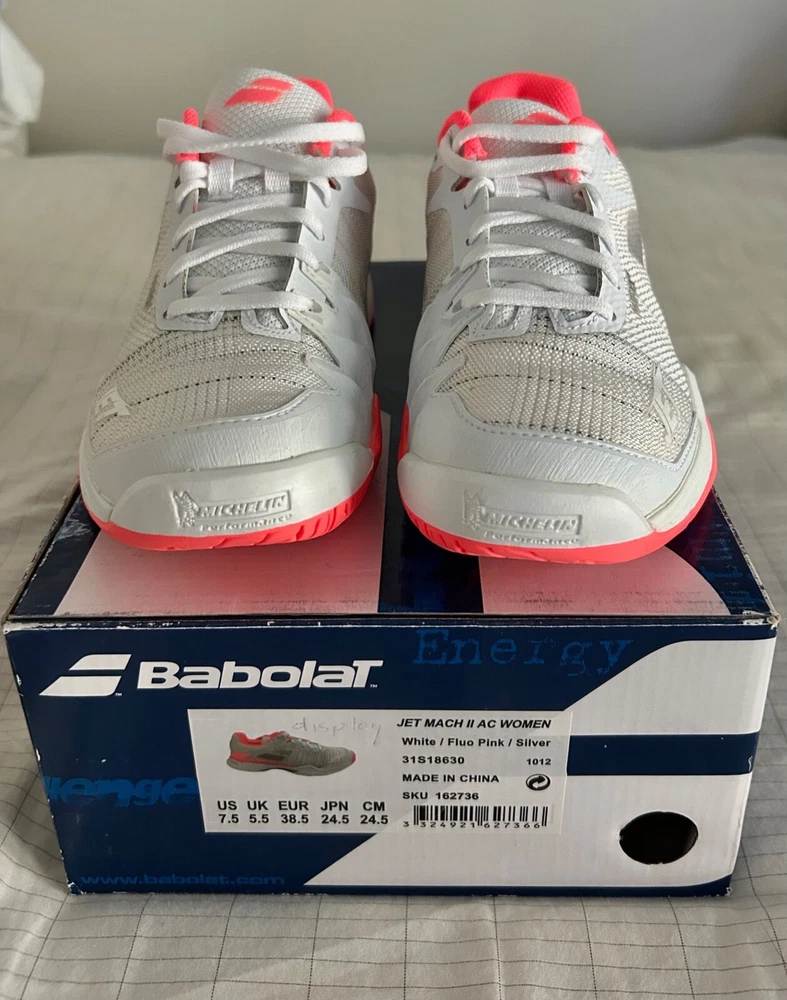 Style: Sneaker Product Line: Babolat Jet UK Shoe Size: 5.5 Customized: No Color: White/ Fluo Pink/ Silver US Shoe Size: 7.5 Performance/Activity: Tennis Character: Silver Country/Region of Manufacture: China Model: JET MACH 2 AC EU Shoe Size: 38.5 Type: Athletic Department: Women Brand: Babolat Features: Arch Support, Breathable, Comfort, Lightweight, Performance, Slip Resistant
