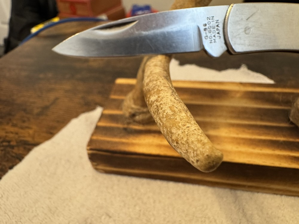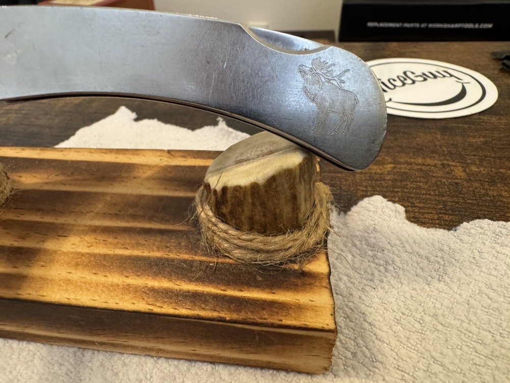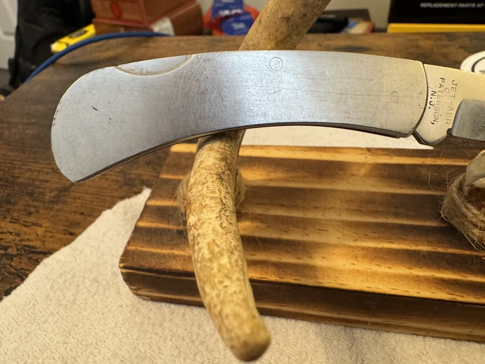 This is a vintage JET-AER Corp pocket knife, the Futura G-96 Model No. 6002, made in Japan in the 1980s. It features a stainless steel drop point blade under 2.75 inches, with a plain edge and a lockback mechanism. The handle also made of stainless steel, includes a moose inlay design. The knife is a manual opening type, ambidextrous, and has a single blade.