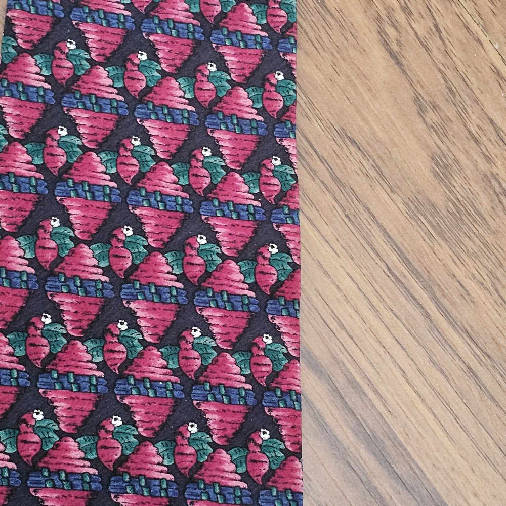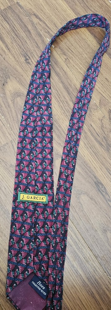 This is a J.Garcia men's necktie featuring a geometric abstract art design in navy blue and purple colors. Made of 100% silk, the tie has a classic length and width. It is designed to be tied and showcases a unique pattern inspired by bees.
