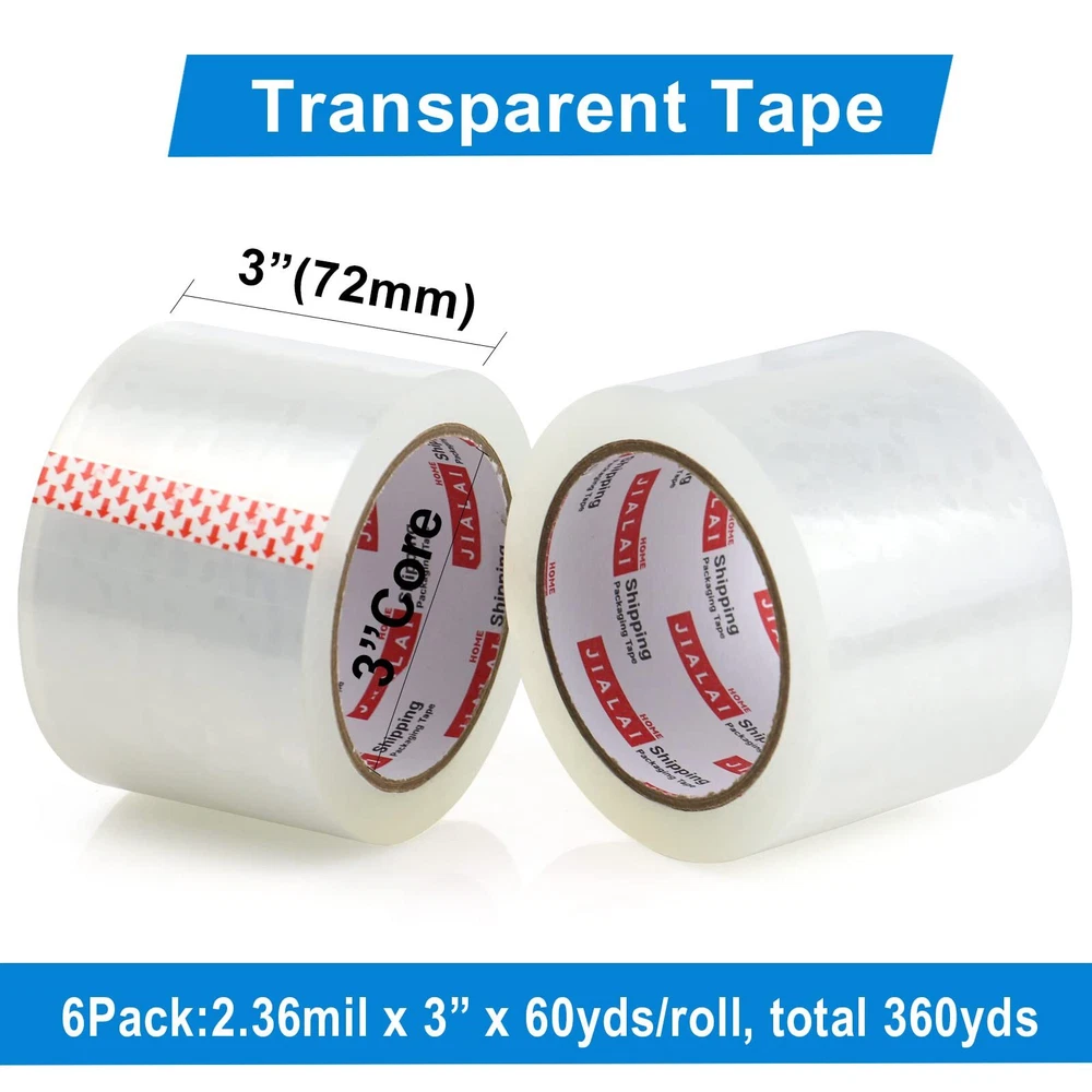 UNIVERSAL STANDARD SIZES: 3 inch wide; 60 yards length; 2.4 mil thickness. The diameter of core is 3 inch and perfectly fit for 3" wide tape dispenser guns or cut with scissors. It will help your warehouse manage the sealing process quick and efficient. Adhesive sticks to smooth and textured surfaces especially on cardboard and carton materials PREMIUM ADHESIVE: 6 Roll of 60 Yards, 2.4 mil thick of high performance clear color packaging tape. No need to tape one box multiple times. 3" Wide Tape does the job in one pass. High adhesion and holding power resists popping for a tight seal throughout the supply chain. Suitable for home, commercial or industrial use in any climate. This storage and shipping box tape can firmly stick onto any surface MULTIPLE USE: Clear color Premium tape is a carton sealing tape that can be used for home removals, shipping and mailing, for storing and organizing household items, but also for anything that one expects from a household multipurpose tape. This moving and packing tape will always come in handy. Clear Acrylic tape will not yellow and retains its clarity over long periods of time, best for long term storage when shelf life is important EASY TO USE: Our 2.4mil thick clear tape is very good in thickness and toughness, will not tear or split easily. Provides excellent holding power for heavy-duty packaging and shipping. Strong seal on all box types, including harder-to-stick-to 100% recycled boxes. It' s easy to open, unwind and suitable for all standard tape dispensers and tape guns EXTREMELY DURABLE: Our transparent clear packing tape offers excellent holding power for packaging and shipping, easy to use shipping tape that will not split or rip during application. High edge tear and split resistance make it ideal for general industrial packaging applications and boxes weighing up to 80 pounds. Performs in a wide range of temperatures for shipping and storing in hot or cold temperatures. Application temperature range 30° - 140° F