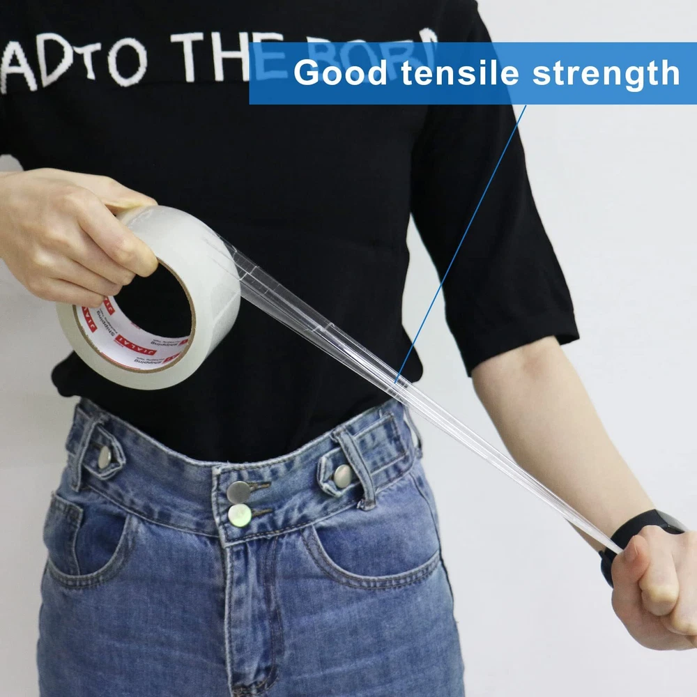 PREMIUM QUALITY:2.4 Mil thick, each roll includes 1.88 inches x 55 yards . Clear tape with strong adhesive that will adhere to your boxes for months and keep your contents safe STANDARD SIZE:The heavy duty packaging tape can be used with any tape guns and hand held tape dispenser with a 3 inch core MULTI PURPOSE:Tape can be used on a variety of surfaces and items. Perfect for all your moving, shipping and storage needs EASY TO USE: Transparent packing tape has strong tenslie stretch, will not split out rip during application and will not peal off, use with easily and save your packing time TAPE DISPENSER:Packaging tape refill rolls with a simple 3inch cutter, can help us work better and more convenient