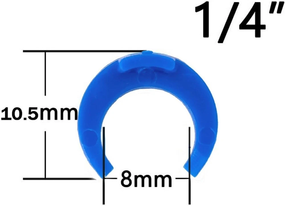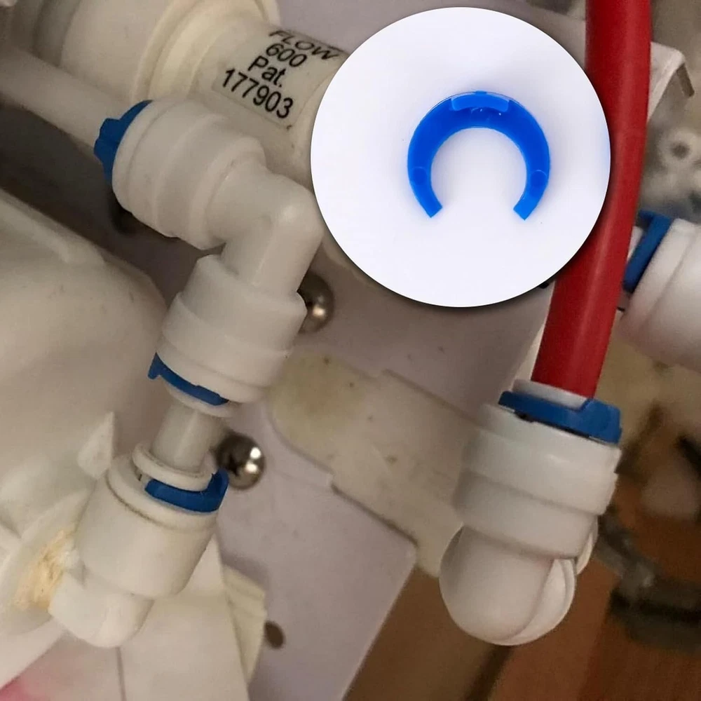 Color: Blue Package Includes -50 pcs Plastic 1/4" Locking clips. Enough quantity for you to use or replace, you can share it with your friends or close neighbors to make life easier Material: We use safe and non-toxic pom material to make the locking clips, which meets the strict requirements for materials in contact with food and drinking water, which makes it widely used in water purification and food/beverage systems Using Experience: This clamp is easy to install and remove, and can be quickly connected and disconnected without the use of other tools. It provides a quick and easy way to prevent leaks. Particularly noteworthy is that these locking clamps can be used on quick push-on connectors, effectively preventing water leaks from accidental loosening of water pipes Installation: Installing the locking clamp is a one-step process; place the clamp opening behind the clevis and press down gently and it snaps into place, securely and safely. Finally, the quick connect clamp is a fixture that ensures that the fittings are securely attached. Overall, these features make quick connect clamps the ideal choice for you Applications: They prevent the sliding hold/release portion of a 1/4 inch pipe connector or valve from inadvertently slipping into and potentially releasing plastic tubing. These locking clamps can be used on reverse osmosis water systems and housing inline filter etcs, and fit standard 1/4" Quick connects used on most reverse osmosis systems