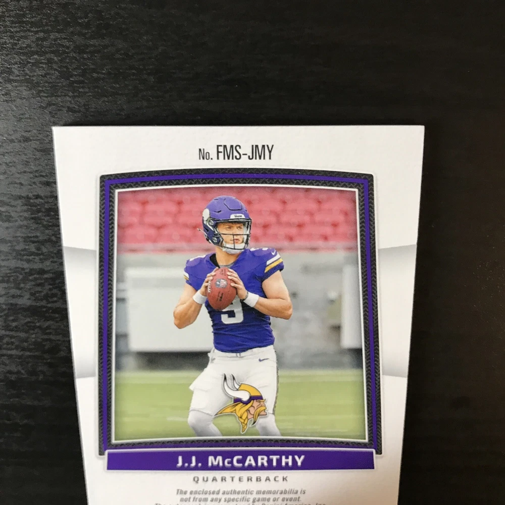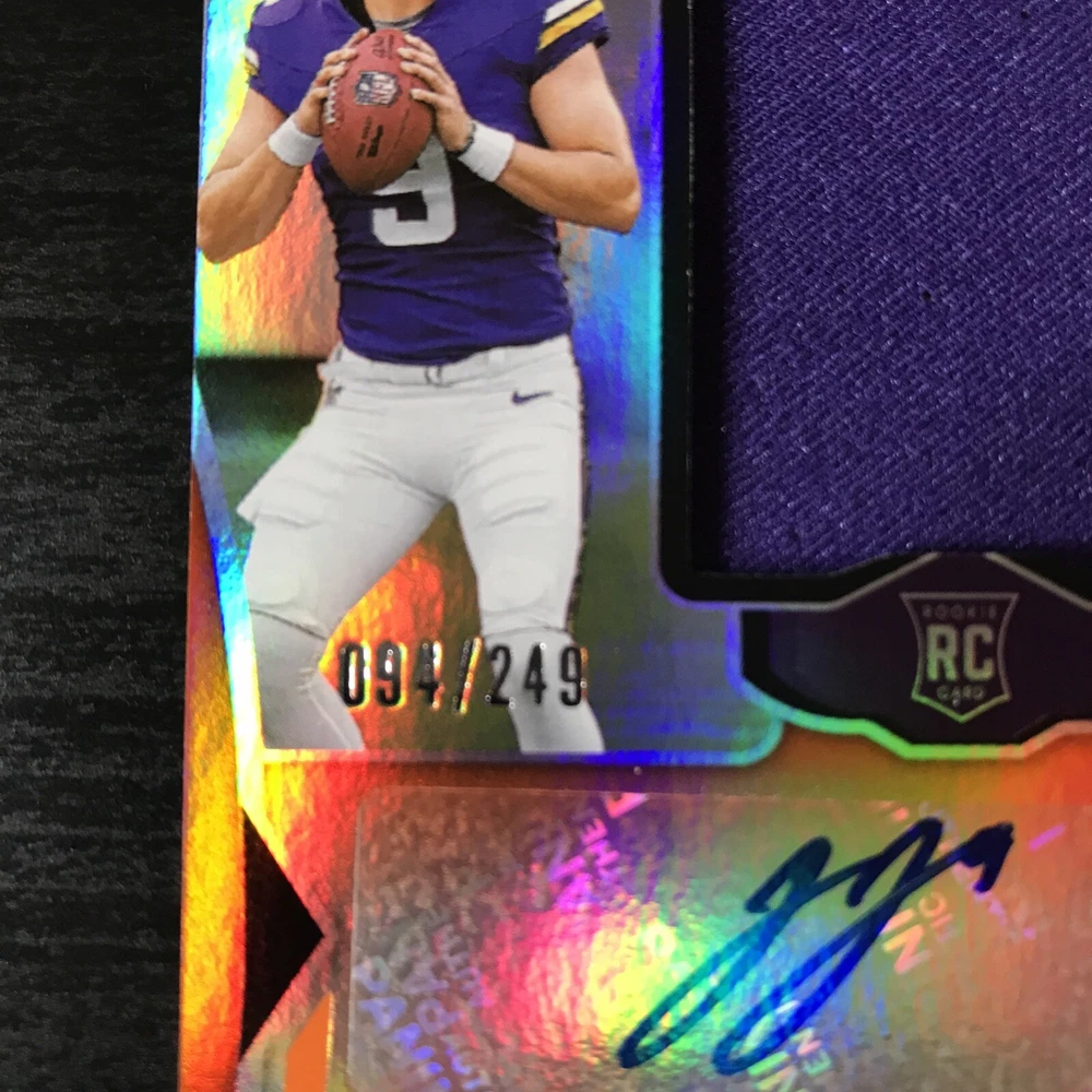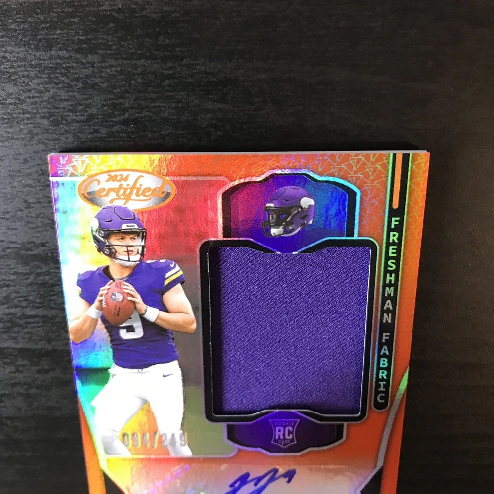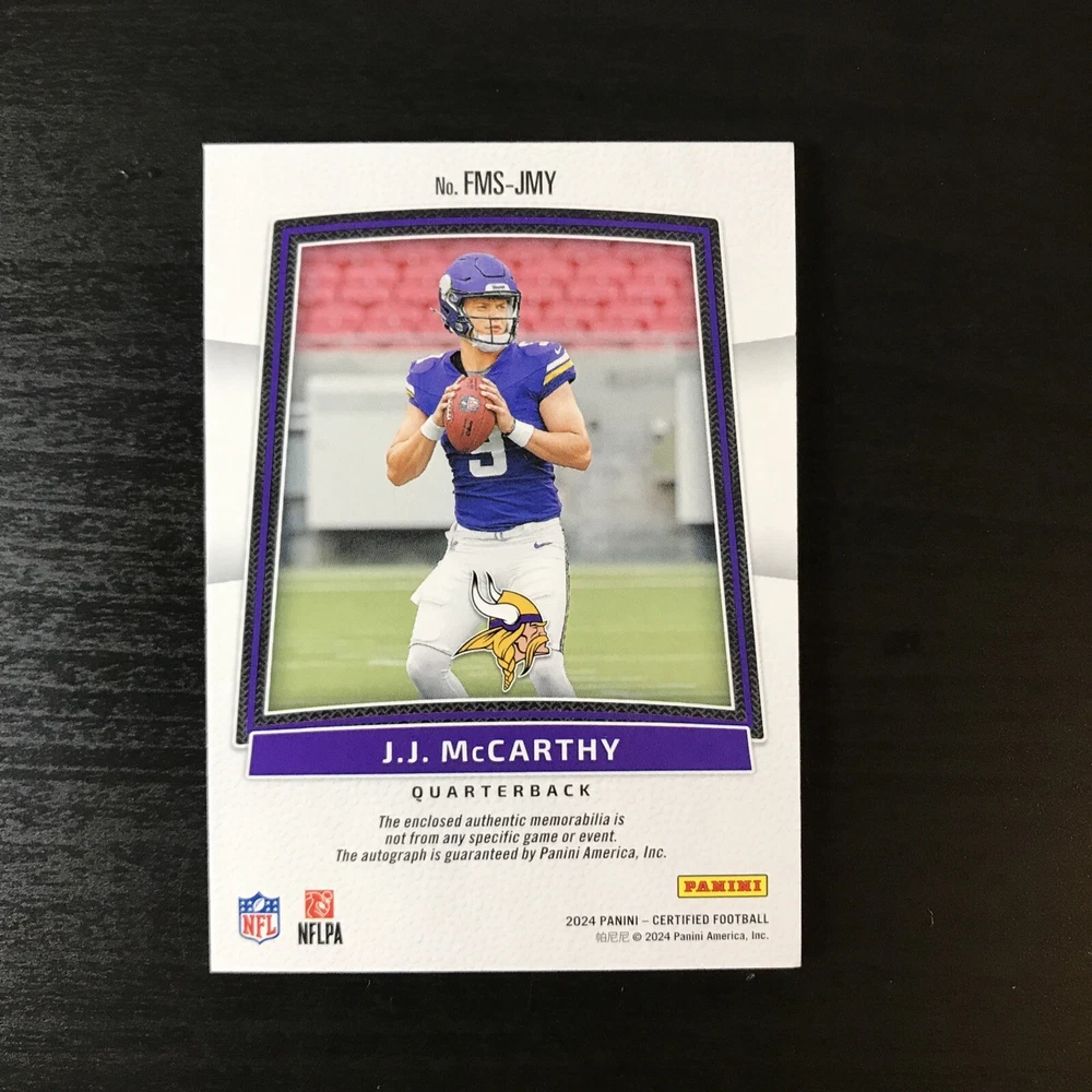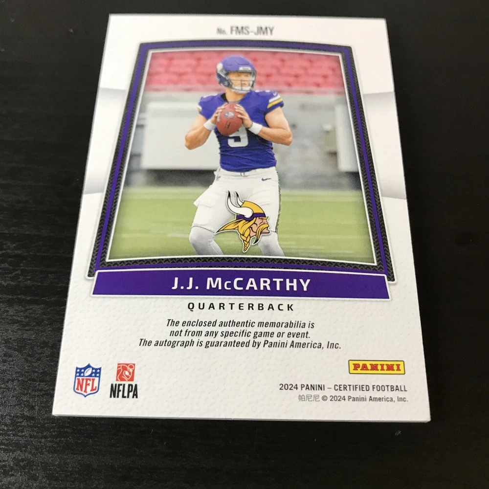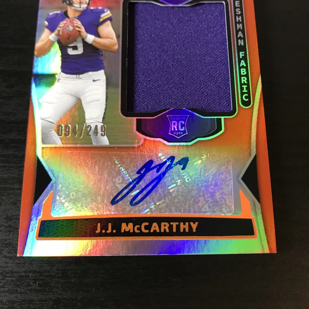 Capture the excitement of the gridiron with this J.J. McCarthy 2024 Certified Orange Freshman Fabric RPA, numbered 094 out of 249. This limited edition collectible features a stunning orange parallel variety that stands out in any collection. As a rookie card, it celebrates J.J. McCarthy's maiden NFL season, making it a must-have for fans and collectors alike. With actual memorabilia embedded in the card, it's not just a piece of paper; it's a slice of football history. Authenticated by Panini Authentic and sealed with the player's autograph, this card from the 2024 Panini Certified set is a testament to McCarthy's potential and a tribute to his early career with the Minnesota Vikings and Michigan Wolverines.