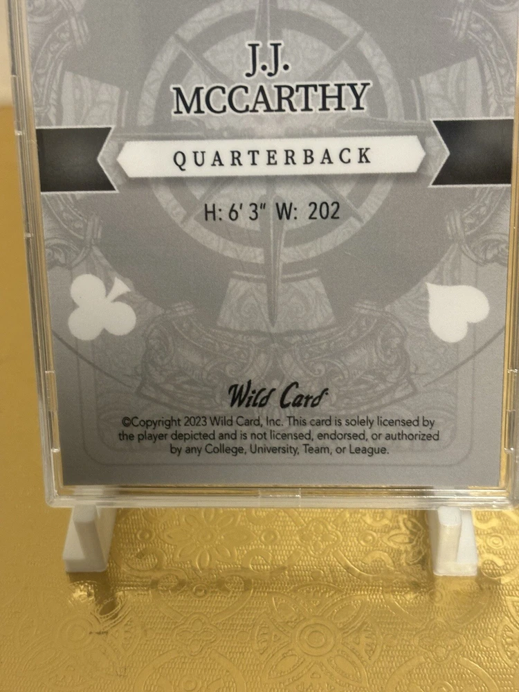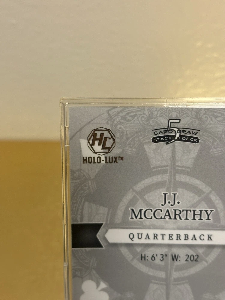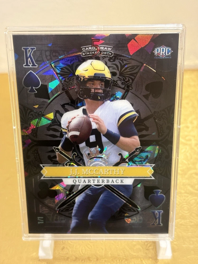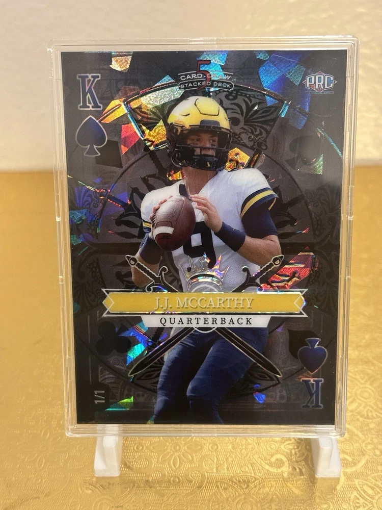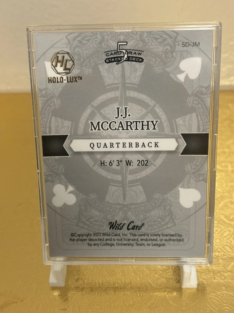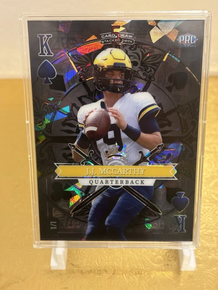 This J.J. McCarthy RC trading card is a must-have for any avid collector. The card features a stacked deck design with a black Ice parallel variety, and is serial numbered as a short print rookie card. This 5 card draw card is from the Wild Card manufacturer, and is part of the National Collegiate Athletic Association (NCAA) and National Football League (NFL) leagues. The card is printed in 2023 and features the University of Michigan and Minnesota Vikings teams. With a print run of only 1, this card is a rare find for any fan of J.J. McCarthy or football in general. Don't miss out on the opportunity to add this unique sports trading card to your collection