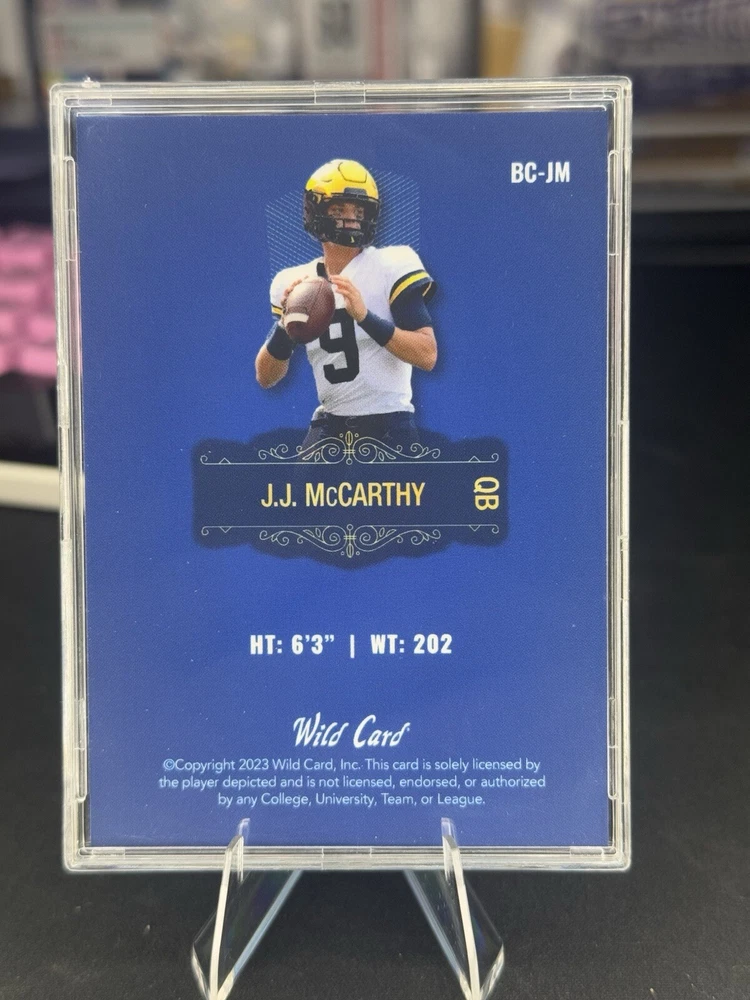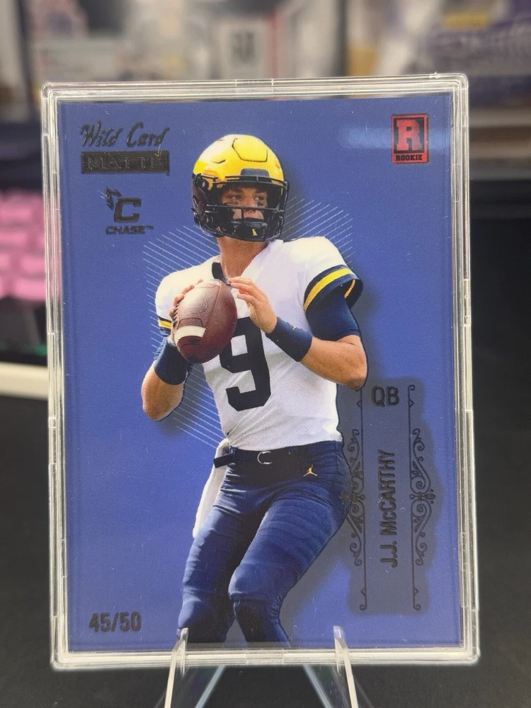 Elevate your sports memorabilia collection with the J.J. McCarthy Wild Card Matte Rookie card, a sought-after piece for any enthusiast or fan of the Michigan Wolverines and Minnesota Vikings. This distinctive card, from the 2023 Wild Card set, boasts a limited print run of just 50, making it a rare addition to your assemblage. Its matte finish ensures a subtle, yet sophisticated aesthetic that stands out. This card features the highly touted rookie in his NFL and NCAA primes, without an autograph, emphasizing the untouched allure of his early career. Serial numbered for authenticity, it's a tangible piece of sports history that celebrates the talent and promise of player J.J. McCarthy. Whether you're a seasoned collector or just starting, this card is a noteworthy acquisition for any collection.