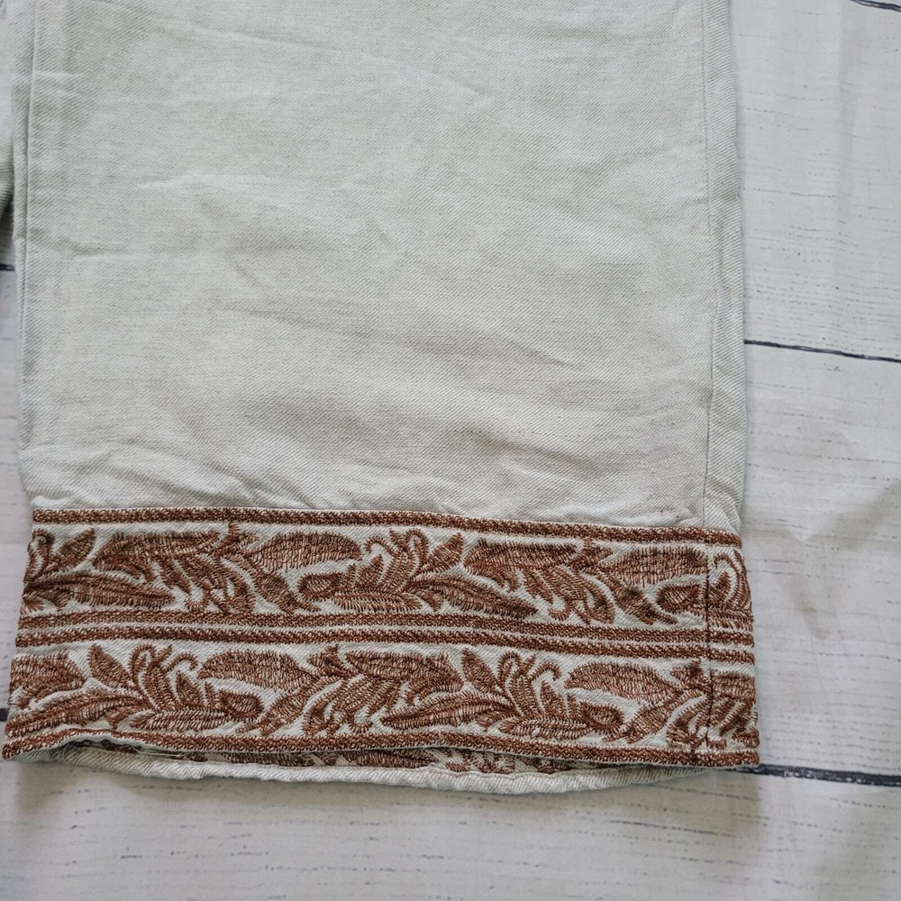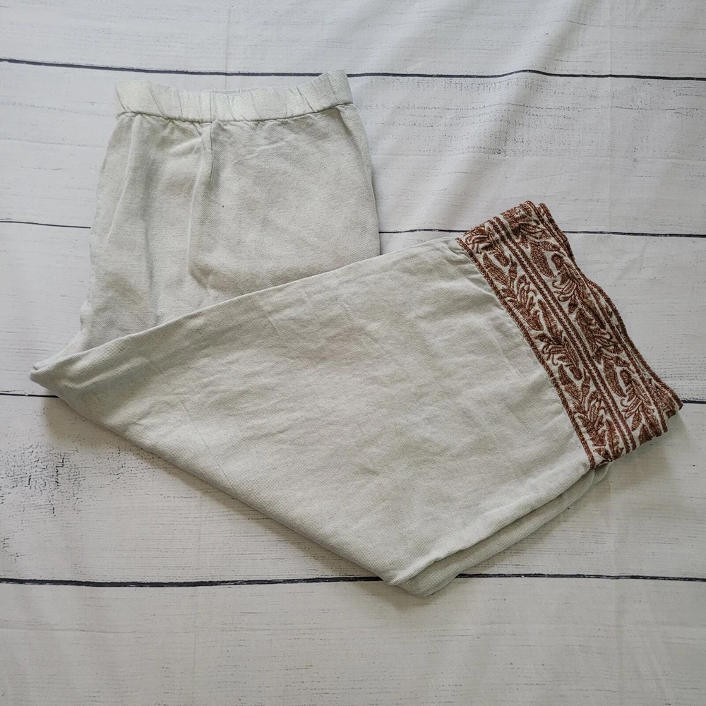 J.Jill Size L Linen Blend Embroidered Hem Wide Leg Pants Pull On Off White Brown Off-white / cream color pull on casual pants from J.Jill Decorative brown leaf embroidery detail on ankle hems Elastic Waist Pockets Wide Leg Cropped -Materials: 57% Linen, 43% Rayon -Excellent, pre-owned condition. No visible stains, flaws or tears. No to minimal signs of previous wear. Measurements included in photos - please inquire if more are needed. All offers considered - make one today! Approximate Measurements: Waist: 32" Rise: 10" Inseam: 22"