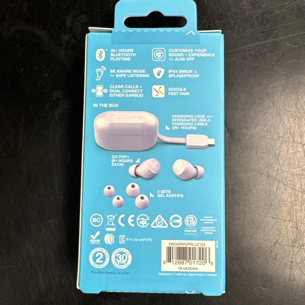 Experience high-quality sound with the JLab GO Air POP True Wireless In-Ear Headphones in Purple. These earbuds are perfect for studio monitoring, DJing, and live monitoring, providing a clear and detailed audio experience. With Bluetooth technology and a built-in microphone, these earbuds allow for easy connectivity and hands-free operation. The earbuds are sweat-proof and water-resistant, making them ideal for intense workouts or outdoor activities. They also feature active noise cancellation and touch control, allowing for easy adjustments and playback controls. The rechargeable battery provides up to 5 hours of playback time, and the included charging case ensures up to 10 hours of battery life. These earbuds are the perfect addition to your audio setup, providing you with high-quality sound and convenience.