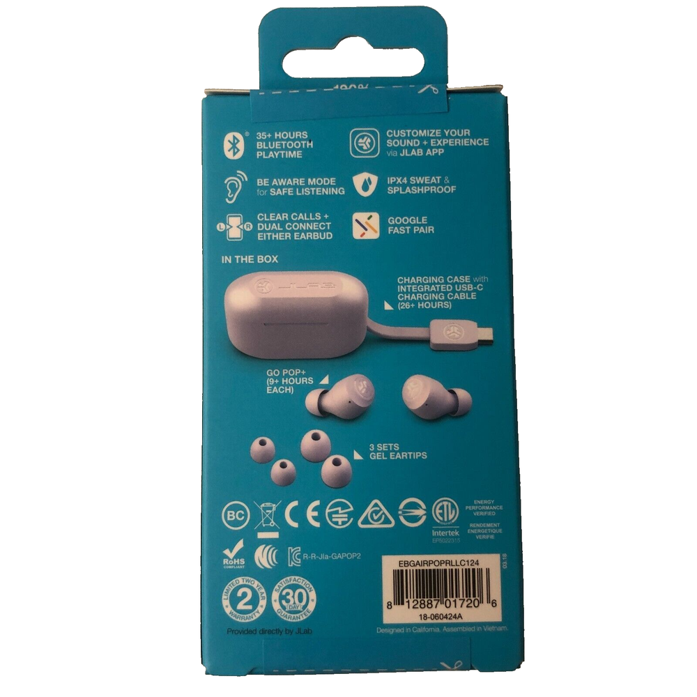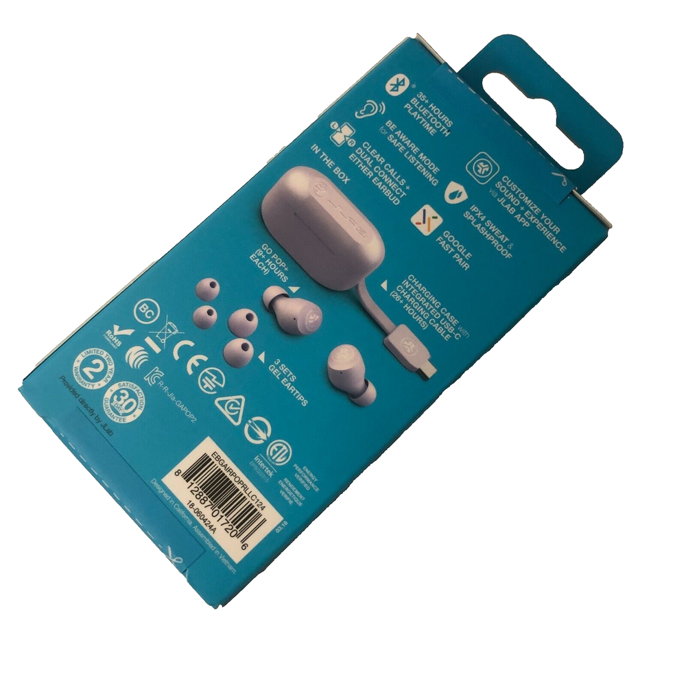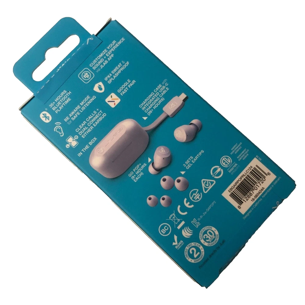 The JLab GO Air POP True Wireless In-Ear Headphones in purple feature Bluetooth technology, replaceable ear tips, touch control, active noise cancellation, and a built-in microphone. With a wireless charging option and water-resistant design, these headphones are suitable for studio monitoring, DJ use, and live monitoring. The headphones have a 30-foot frequency range and come with HD voice, extra bass, and volume control. Perfect for on-the-go music enthusiasts.