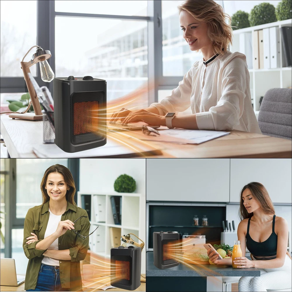 2 in 1 Heater and Air Fan:The small heater offers two heat settings, 1500W or 750W, along with a cooling fan function, making it usable in both winter and summer. The heater's thermostat control automatically shuts off the heating element when the preset temperature is reached, and it reactivates the heater when the temperature falls below the thermostat setting. Multiple Safety Protections:The space heater is constructed from flame-resistant materials, utilizing an upgraded version of ABS material that enhances flame resistance, effectively mitigating any risk of fire hazard. The Overheat Protection feature automatically shuts down the heater when it reaches a critical temperature. The tip-over protection system also deactivates the heater if accidentally tipped over; upon righting the heater, it resumes operation. Compact and Portable:The heater for indoor use measures 6.2 inches x 7 inches x 10.2 inches and weighs 2.9 pounds. It comes with a 6-foot power extension cord and an integrated handle, allowing convenient mobility for use in offices, rooms, and on desks. The mini heater is designed to heat up 200 square feet. Quiet and Rapid Heating:The portable heater operates with noise levels below 46 decibels, ensuring a tranquil environment suitable for most individuals to use while sleeping in bedrooms. Employing PTC ceramic heating technology and a high-speed fan, this heater is capable of emitting substantial heat within seconds, rapidly warming spaces of up to 200 square feet. After Sale Service:ETL Certified, Our friendly and reliable customer service will respond to you within 24 hours. You can purchase with confidence, with our 30-day return and 12-month replacement.