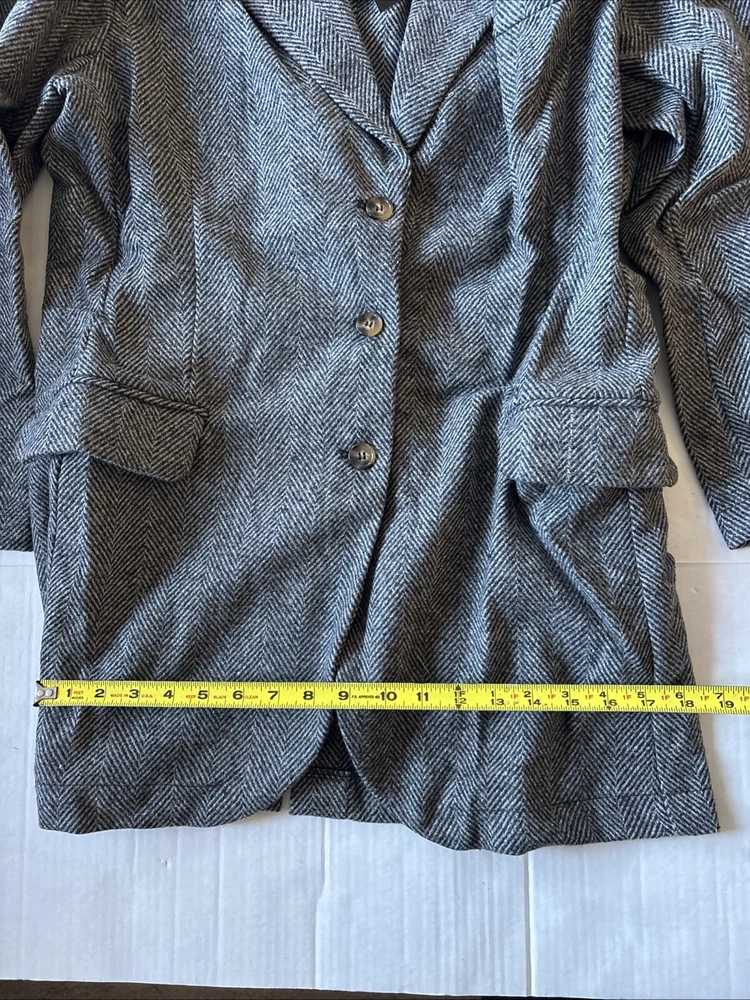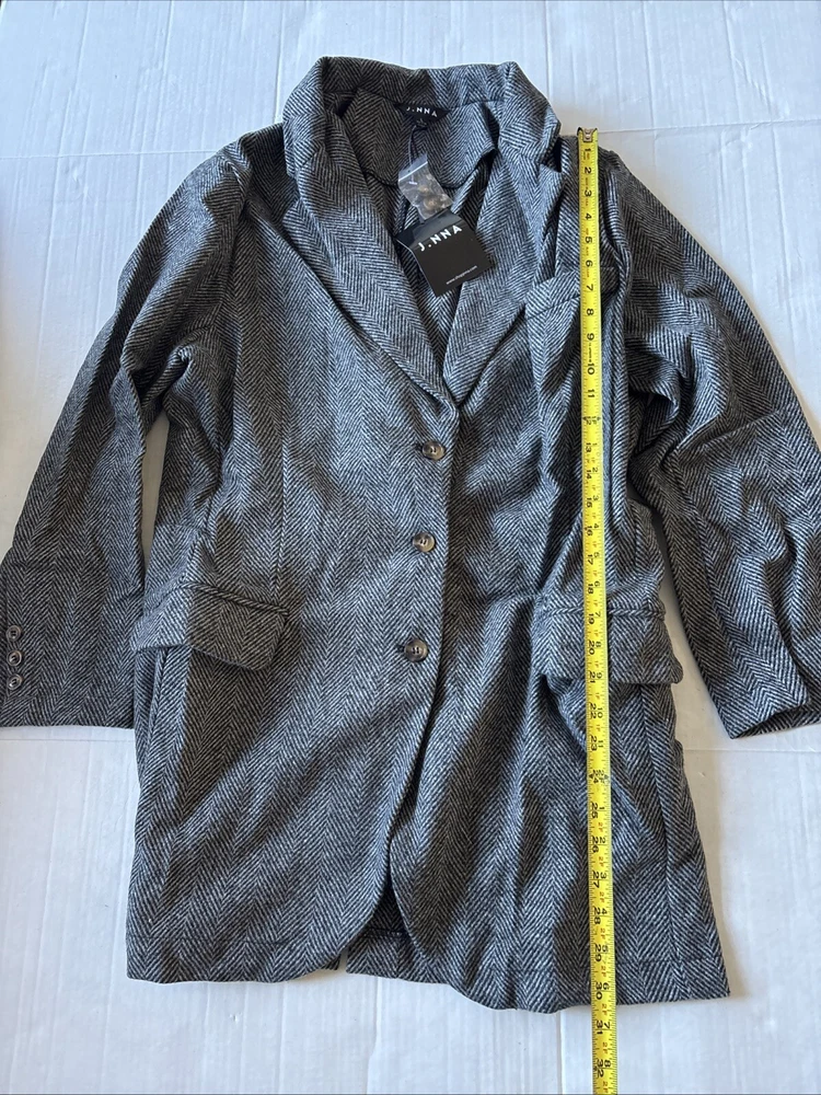 This J.NNA overcoat is a stylish addition to your winter wardrobe. The herringbone pattern on the gray Polyester outer shell material is eye-catching, and the tie closure adds a touch of elegance. The jacket features pockets for convenience and a tie-back detail that enhances the overall look. The lining is also made of Polyester, ensuring that the coat is warm and comfortable to wear. The jacket is perfect for the fall and winter seasons and is available in a size L. The star theme adds a unique touch to the coat, making it stand out from other overcoats. This J.NNA coat is a must-have for any fashion-forward woman who wants to stay warm and stylish during the colder months.