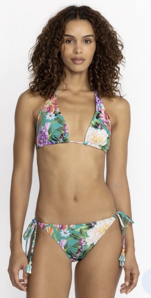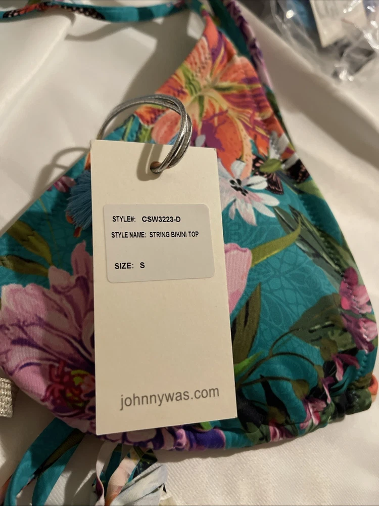 The JOHNNY WAS Size-S Peacock Goza String Bikini Top and Bottom Set is a stylish and colorful 2-piece bikini set designed for women. The geometric pattern, spaghetti strap top, and multicolor design give it a unique and vibrant look perfect for beach days or poolside lounging. The set includes a bikini top with removable pads, a built-in brief, and an adjustable strap for a comfortable fit. The lightweight and quick-drying material ensures you stay comfortable and dry while enjoying the sun and water. Perfect for those who love a tropical, goddess-inspired style.