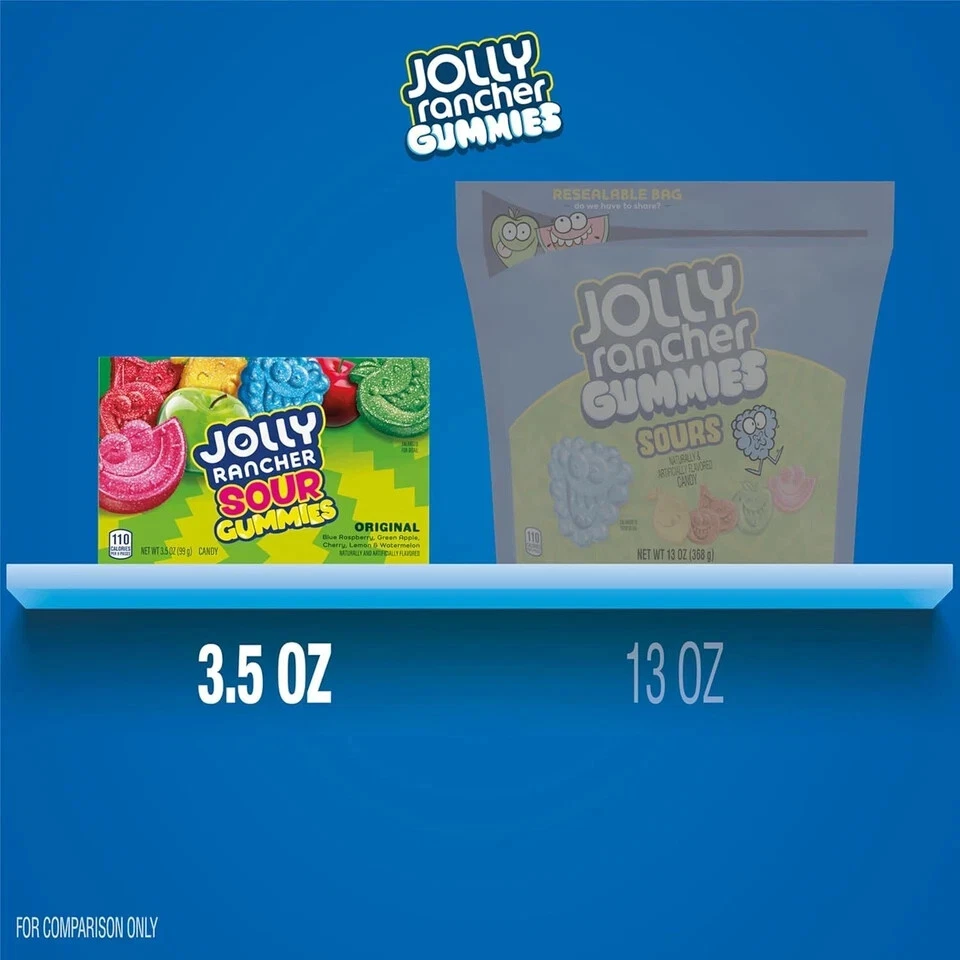 JOLLY RANCHER Sour Gummies Assorted Fruit Flavored 3.5 Ounce (Pack of 1) Product Details Product Dimensions : 1 x 6 x 3.75 inches; 3.84 ounces Item model number : 00010700858412 UPC : 010700858412 Manufacturer : HERSHEY COMPANY Units : 3.5 Ounce Brand: Jolly Rancher Flavor: Assorted Fruit Flavored Item Form: Gummy Unit Count: 3.5 Ounce Number of Items: 1 Contains one (1) 3.5-ounce box of JOLLY RANCHER Sour Gummies Assorted Fruit Flavored Candy Soft and chewy gummy candies bursting with sweet, sour original fruity flavors like watermelon, green apple, cherry, lemon and blue raspberry for snack time at home, at work and on the road An exciting assortment of chewy gummies candy in a movie box ready to satisfy your snacking needs and keep each deliciously sour piece fresh Bring a shareable box of delectably sweet and sour gummy treats to birthday parties, New Year's bashes, wedding celebrations and baby shower candy buffets An unbelievably delicious gummy selection featuring bold colors and even bolder fruit flavors to brighten up your Valentine's Day, Christmas, Halloween and Easter candy selections A mix of five fruity favorites for the whole family in just one box of chewy gummies? You wouldn't have thought it possible if you didn't know JOLLY RANCHER gummies candy. This box of sour fruit flavored gummies offers fun, flavorful fruity shapes each member of the family will be happy to choose from. Featuring blue raspberry, green apple, cherry, lemon and watermelon flavors, JOLLY RANCHER sour gummies offer a combination of the undisputed original flavor classics you already know and love.