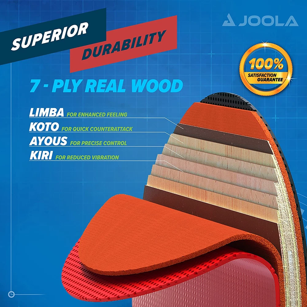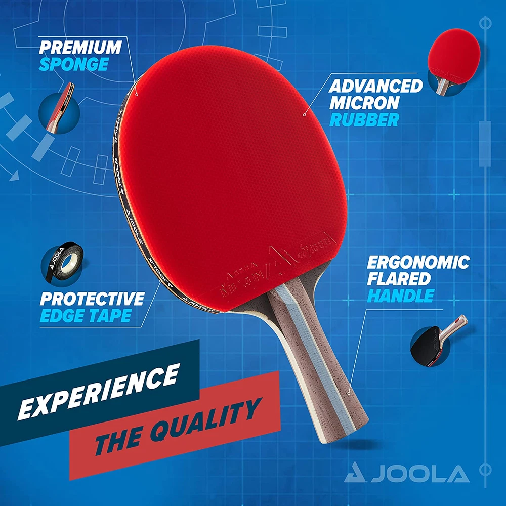 JOOLA - AN OLYMPIC TABLE TENNIS BRAND TRUSTED FOR 60+ YEARS: Launched in the 1950s, JOOLA has been the proud sponsor of the biggest tournaments in the world, Including the Olympics, World Championships, and US Open. Equipment designed for all levels. ITTF REGULATION SIZE: The JOOLA Balance ping pong racket comes with a smooth inverted surface and comfortable ergonomic flared grip handle for enhanced performance and spin. Table tennis equipment for kids and adults. PLAY LIKE A CHAMPION: The perfect balance of design with all the elements of a professional ping pong racquet to take your game to the next level. Flexible PVC edge tape protects the side of the racket. SUPERIOR QUALITY AND DURABILITY 7 PLY REAL WOOD: Only the best materials are combined together, Limba, Koto, Ayous, and Kiri wood, to create the perfect combo for increased control and spin. Great for the family game room. PERFORMANCE RATINGS (SCALE 0-100) - Speed: 92, Spin: 92, Control: 92. Includes JOOLA Method 38 Table Tennis Rubber on both sides. Does not come with ping pong balls. Great gift for someone who already owns an indoor or outdoor JOOLA ping pong table. From the manufacturer Add to Cart Add to Cart Add to Cart Add to Cart Customer Reviews 4.4 out of 5 stars 336 4.5 out of 5 stars 469 4.5 out of 5 stars 970 4.5 out of 5 stars 282 Price $41.66 $ 41 . 66 $47.99 $ 47 . 99 $61.99 $ 61 . 99 $16.66 $ 16 . 66 Classification Tournament Performance Professional Performance Top-Level Professional Performance Premium Performance Speed 92 95 100 75 Spin 92 94 99 75 Control 92 94 92 97 Play Style Control, Speed, & Spin More Speed More Speed & Spin Control & Spin Rubber Micron Micron Micron Vizon Layers 7 Ply 7 Ply with Carbon 7 Ply with Carbon Kevlar 5 Ply Color Rubber Red & Black Black & Black Black & Black Red & Black Perfect For Quick Counter-Attacks Fast Hitting and Larger Sweet Spot Fastest Hitting and Spin Precise Control