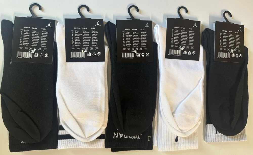Elevate your sock game with these Jordan crew socks. This pack includes five pairs of colorful, striped socks featuring the iconic Jordan logo. Perfect for casual occasions, these mid-calf socks are made for men in size 8-12. The lightweight crew socks are suitable for all seasons and activities such as gym training, track and field, riding, tennis, walking, cycling, soccer, lacrosse, basketball, and football. These socks are not handmade and come from China. Add these classic and stylish socks to your wardrobe today.