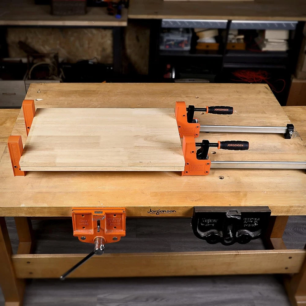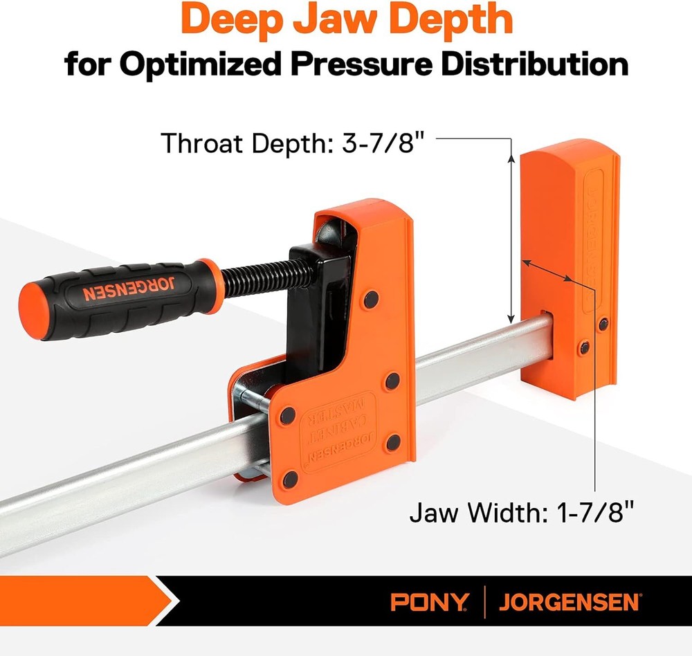 Package: 1X JORGENSEN 24-inch Bar Clamps, 90°Cabinet Master Parallel Jaw Bar Clamp Set, 2-pack Description: Maximum opening capacity is 24 inches. Heavy-duty steel jaws and high-carbon steel bar for up to 1500 lbs. of clamping force. A reversible head enables spreader clamping and a clamp stand provides easy adjustments, while the maple handles won't wear down your hands. Reinforced steel and castings protected by orange plastic add strength to the jaws. Ideal for a wide range of woodworking such as panel glue-ups, boxes, cabinets, frames and raised panel doors. No any customs tax for you,we will pay.