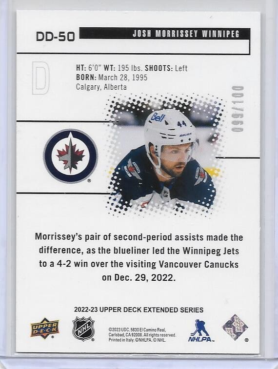 THIS AUCTION IS PAYPAL ONLY! ( NO E-CHECKS/CREDIT CARD PAYMENTS ACCEPTED!) SERIOUS BIDDERS ONLY! YOU ARE BIDDING ON A JOSH MORRISSEY 2022-2023 UPPER DECK EXTENDED SERIES BLACK DIAMOND DOMINANCE EMERALD SHORT PRINT INSERT CARD # 99/100 # DD-50. THE CARD IS IN EXCELLENT TO NEAR MINT CONDITION (NEW), AND IS WELL PROTECTED, AND READY TO BE SHIPPED AFTER PAYMENT IS RECEIVED. PAYMENT IS EXPECTED WITHIN 48 HOURS. SHIPPING TO THE UNITED STATES IS 1-3 CARDS FOR 4.99, 0.50 PER CARD AFTER THE FIRST 3 CARDS. INTERNATIONAL SHIPPING TO CANADA IS A FIRST CLASS INTERNATIONAL LETTER, 1-2 REGULAR CARDS FOR 3.00. ANY MORE CARDS THAN THE TWO CARDS IS A PARCEL, WHICH TO CANADA IS 13.99 AND UP. A INTERNATIONAL LETTER TO EUROPE AND ELSEWHERE IS 1-2 REGULAR CARDS FOR 4.00. ANY MORE CARDS THAN THE TWO CARDS IS A PARCEL, WHICH TO EUROPE AND ELSEWHERE IS 17.99 AND UP. ANY QUESTIONS CONTACT ME BEFORE BIDDING! ALWAYS WAIT FOR INVOICE TO BE SENT. (NO BIDDERS IF YOUR FEEDBACK IS LESS THAN 100, OR RECENT NEGATIVE FEEDBACKS, UNLESS YOU CONTACT ME FIRST NO EXCEPTIONS.) ALL SALES ARE FINAL. PLEASE CHECK OUT MY OTHER AUCTIONS AS THEY ARE BEING LISTED. THANK YOU, IF YOU HAVE ANY QUESTIONS PLEASE CONTACT ME. HOCKEYJIM63MAINE-JIM PULLEN. HOME OF THE TWO TIME NCAA HOCKEY CHAMPS MAINE BLACK BEARS