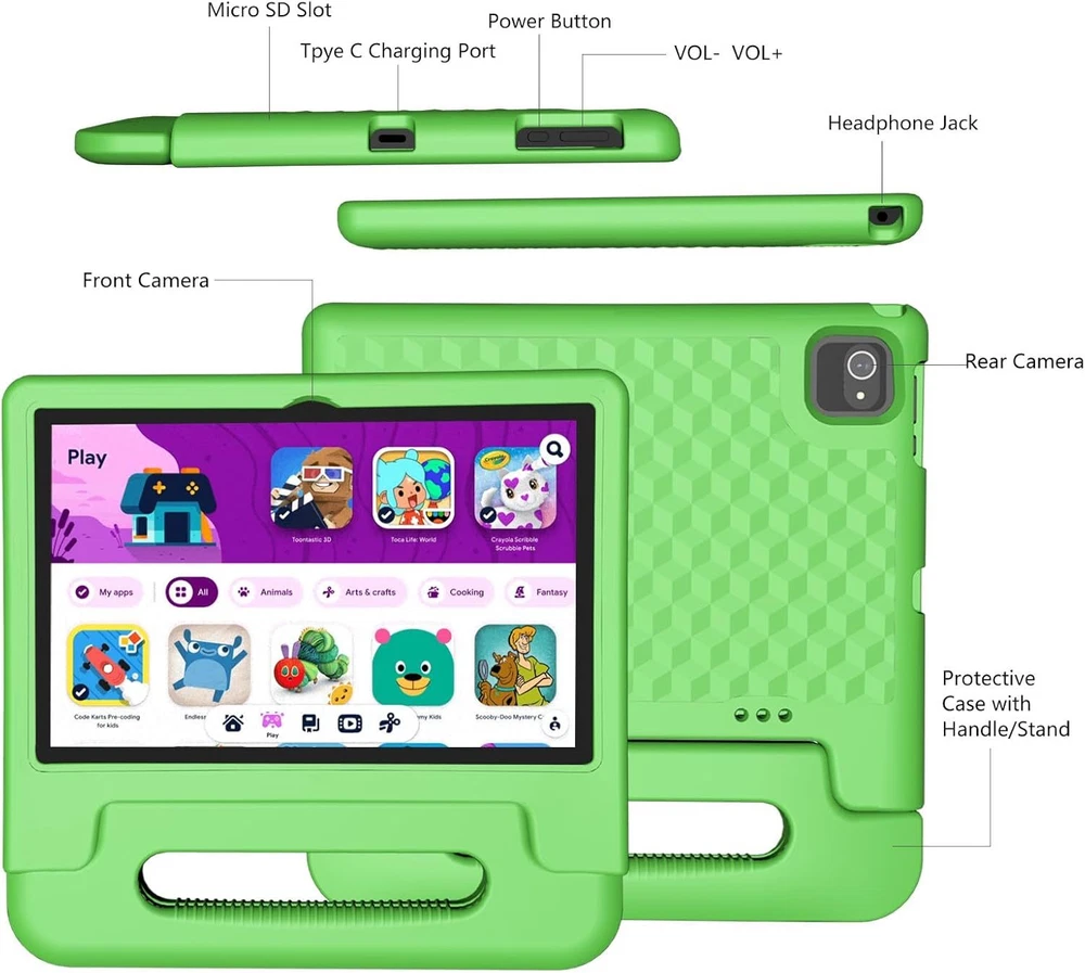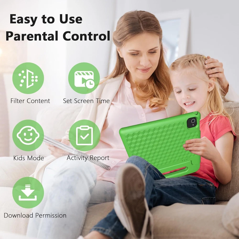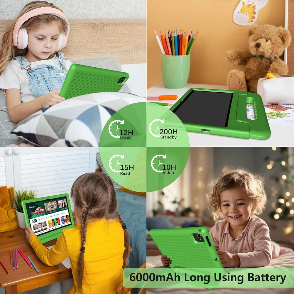 JREN Kids Tablet 10.1 inch Tablet for Kids, Toddler Tablet 8GB+64GB Android 14 Parental Control, 1TB Expand, HD Touchscreen, WiFi, Bluetooth, Protective Case for Kids Learning Tablet - Green Product Details Standing screen display size: 10 Inches Screen Resolution: 1280 x 800 pixels Max Screen Resolution: 1280*800 Pixels Card Description: Integrated Wireless Type: 802.11n Average Battery Life (in hours): 8 Hours Brand: JREN Model Name: J10 Plus Memory Storage Capacity: 64 GB Screen Size: 10 Inches Display Resolution Maximum: 1280*800 Pixels 【Android 14.0 Kids Tablet】 JREN 10.1 inch kids tablet comes with 8GB RAM (4G+4G Virtual) and 64GB ROM, you also can expand the storage to 1TB via the additional SD card, provide enough storage to store all your kids' favorite apps, games, photos, music and videos. Android 14 operation system and octa-core processor enable JREN kids tablet response quickly, combine with 1280*800 IPS HD touch screen let your kids enjoy smooth and vivid tablet using experience. 【GMS Certified & Parental Control Tablet】 JREN tablet for kids is certified by Google GMS, giving full access to popular Google service and apps. It’s pre-installed with Google Kids Space that designed for children over 3 years old, which can meet the diverse children’s learning and entertainment needs. Easy-to-use parental controls allow you filter content, set screen time, APP download permission and track the location, which create a safe online playing and learning environment for kids. 【Long Battery Life Tablet】With built in 6000mAh lithium battery, JREN 10.1 inch kids tablet can support up to 12 hours of reading, watching and listening. It’s an ideal educational and entertainment tablet for kids. Featuring fast charging technology with type C port, this kids tablet can be fully charged in 4 hours when using the provided charger. Besides the hand set screen time, eye caring mode also provide an extra protection for kid’s eye, no worry about the long using of kids tablet. 【Adjustable Stand Tablet for Kids】 This tablet protective case is made of EVA material that protects the tablet from scratches, bumps, drops, etc. Ergonomic handle enable the toddlers carry the tablet easily, equipped with 2MP front camera and 5MP back camera let the kids capture what they see and keep their happy memories. It’s handle can be set as stand which can allow kids for hands-free watching, learning and video call.