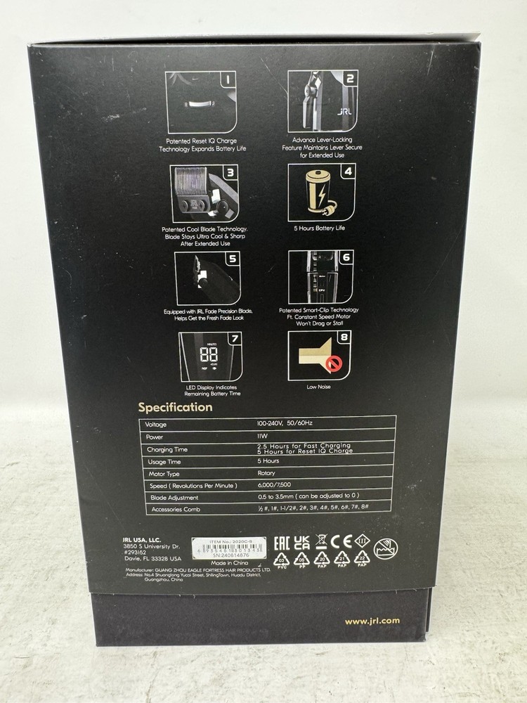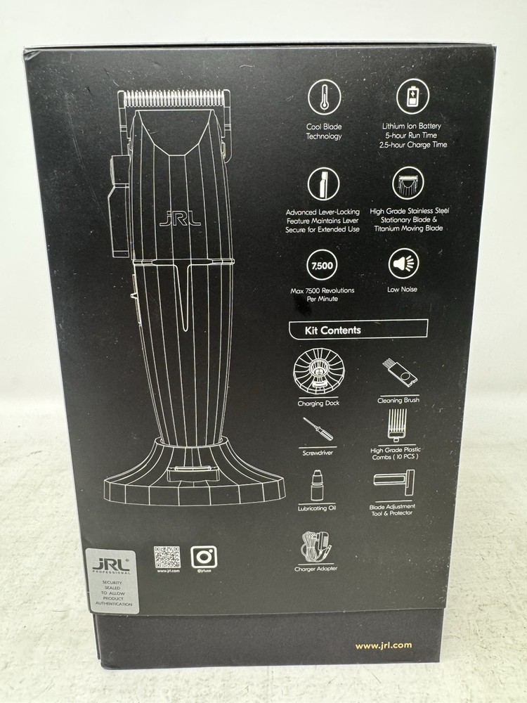 Open box condition Never used Features & Benefits: Patented Reset IQ Charge Technology: A new way of charging that extends the battery life. This design will consistently charge to 100% even after extended use. 3 Hours For Regular Charging, 5 Hours for Reset IQ Charging. Patented Smart-Clip Technology: Clipper senses blade resistance and revs up the motor speed, therefore clipper will never drag or stall. Guarantees a smooth even cut every time. Constant power: 2-Adjustment speeds for cutting versatility, 6,000 & 7,500 RPM and maintains speeds during run time. Equipped with Onyx Fade Precision blade: Helps get the fresh fade look, Max. length: 3.5mm Quiet Motor: Creates a quiet work environment Max 5 hours run-time: 3 hours of charging produces 5 hours battery life Advanced lever locking feature: 5 Steady level locking adjustments with infinite variable control that maintains over long term use. Patented Cool blade technology: Special material keeps blade cool to the touch making blade cooler than most clippers in a 30-minute test. Blade is also interchangeable with most professional clipper brands. LED Display: LED display indicates remaining battery time in the current speed setting. Reset iQ charging dock is included 30 days free returns: Item must be returned in exact SAME condition, with all accessories, components and original packaging in order to receive a full refund, otherwise a deduction of minimum 15% will be applied based on the condition of your return.
