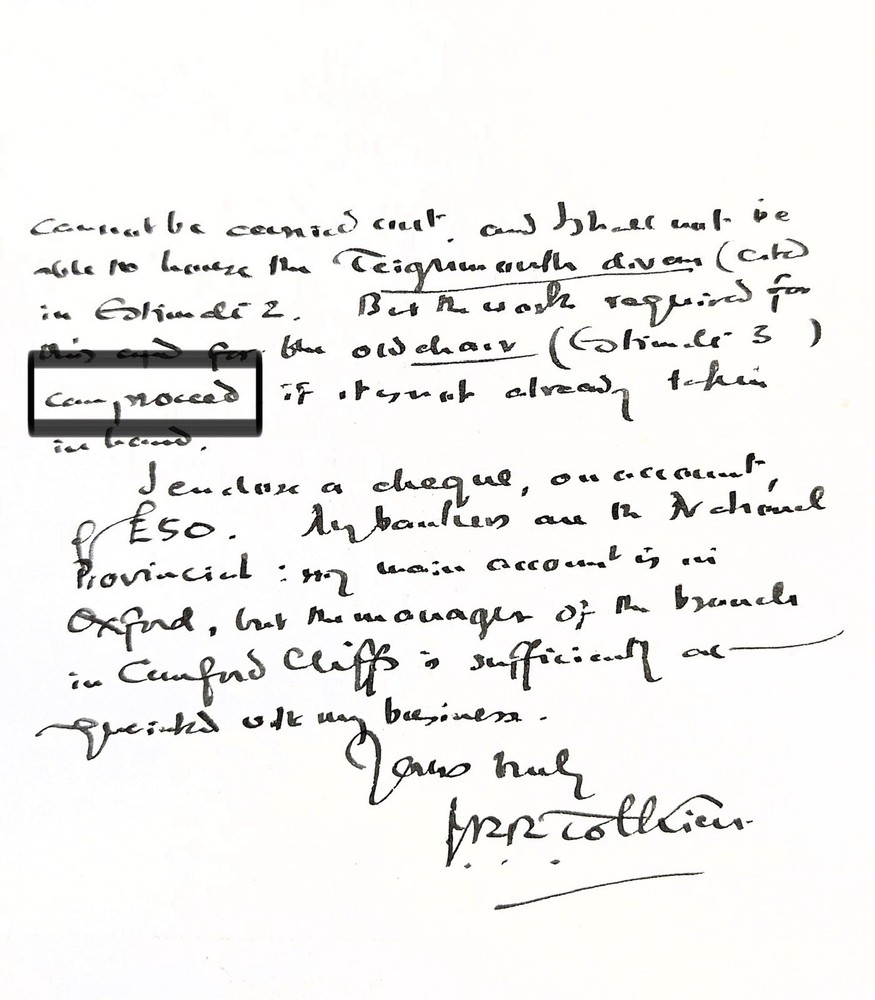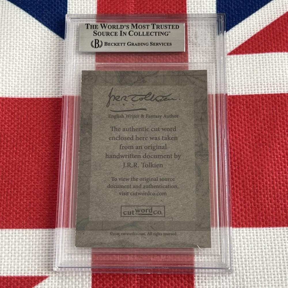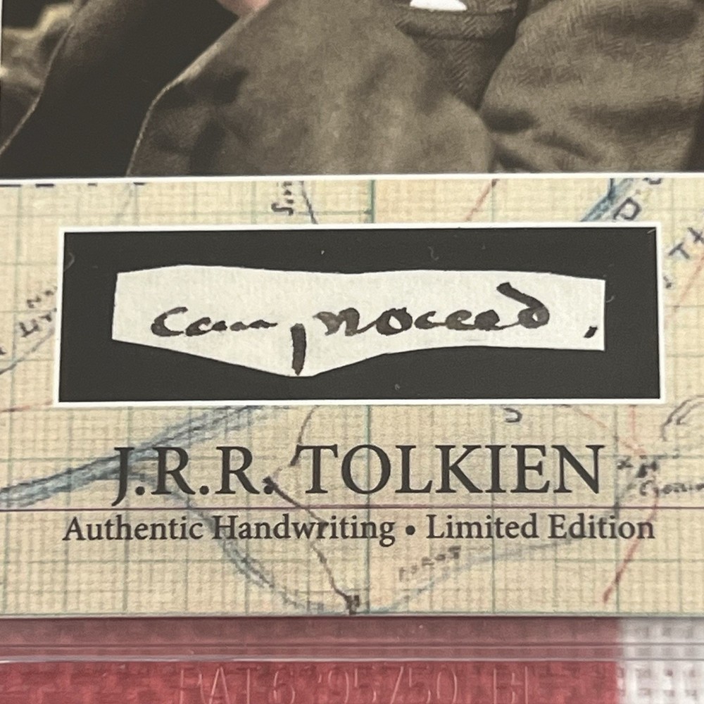 Offered in extremely limited quantity – genuine handwriting from legendary "Lord of the Rings" and "The Hobbit" author J. R. R. Tolkien, authenticated and encapsulated by (BAS) Beckett Authentication Services. Each handwritten word was carefully removed from a handwritten letter Tolkien wrote in September, 1968. You will not receive a copy of the letter from Tolkien, the 4th image is shown purely to illustrate where the words came from. You will only receive the BAS encapsulated handwriting, "can proceed", encapsulate #00018690851. The slab measures 3.25 inches by 5 inches. [NOTE: You will also NOT receive the George Washington word pictured in the final image of this listing. This graphic is for illustration / informational purposes only]. Each encapsulated word was individually removed from a September 25, 1968 letter written by Tolkien from Oxford to Messrs Maple & Co. of Bournemouth concerning household furnishings and payments. Genuine Tolkien autograph letters are exceptionally scarce and can fetch thousands of dollars. This encapsulated word offers a rare and affordable opportunity to own an authentic piece of Tolkien’s handwriting. The cost of authenticating a single word of Tolkien’s handwriting is $100 on Beckett’s website.