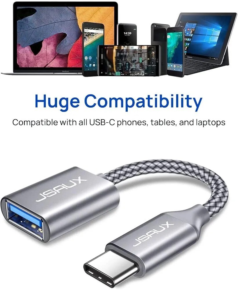 JSAUX USB C to USB Adapter 2 Pack USB Type C Male to USB 3.0 Female OTG Cable 【USB On-The-Go】: Plug in and use computer peripherals, such as flash drive, keyboard, hub, mouse, and more, makes your USB-C devices compatible with USB drives and any other USB devices that support USB On-The-Go. 【USB 3.0 Super Speed Transfer】: Full USB 3.0 super speed data transfer up to 5Gbps, 10x faster than USB 2.0. Transfer files, HD movies, and songs to your USB-C devices in seconds. 【Nylon Tangle-free Design】: Tangle-free Nylon Braided Design, this USB 3.0 Cord is far more dependable than others in its price range. Premium nylon braided cable adds additional durability and is tangle-free. 【Durable Aluminum Body】: Made out of durable aluminum alloy, innovative engineering ensures durability and a long life span. 【What you get】:Compatible with all USB C devices, Samsung Galaxy Note8 S9/S9 Plus S8/S8 Plus, Apple New Macbook Pro, LG G6 G5 V20 and More.