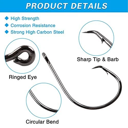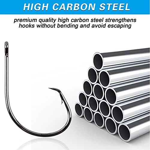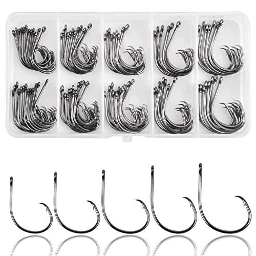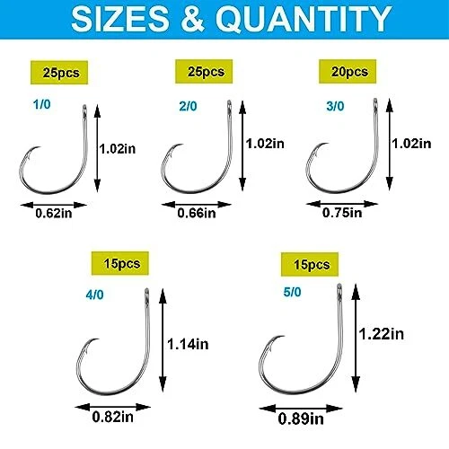 100pcs fishing circle hook kit: 1/0-25pcs 2/0-25pcs 3/0-20pcs 4/0-15pcs 5/0-15pcs 130pcs fishing circle hook kit: 5/0-50pcs 6/0-25pcs 7/0-20pcs 8/0-20pcs 9/0-15pcs Package Included: 100pcs fishing hooks kit of 25pcs 1/0, 25pcs 2/0, 20pcs 3/0, 15pcs 4/0, 15pcs 5/0. Ultimate Design: The circle hooks with closed straight eye, special barb design, sharp needle point, great for catch and release. High Strength: The saltwater circle Hooks are made of high carbon steel, high strength and corrosion resistance, suitable for freshwater and saltwater fishing. Catch & Release Hooks: Inline circle hooks designed to ensure that the hook point rolls in the corner of the fish's mouth and lowers fish mortality. Wide Application: Inline circle hooks ideal for natural and live baits in salt and fresh water. Perfect for catching bass, catfish, walleye, tarpon, redfish, snapper and sea trout.