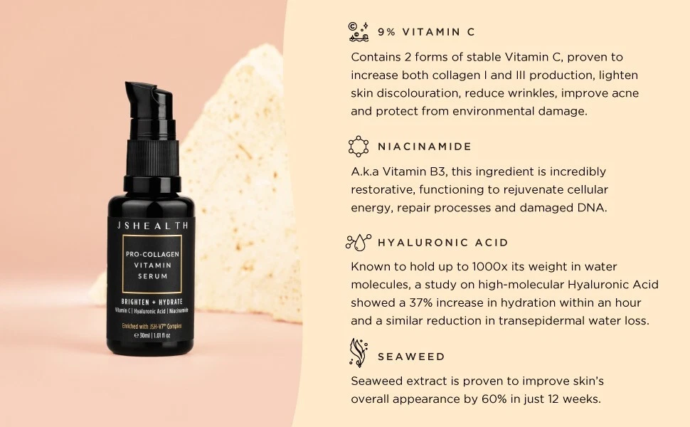 JSHealth Vitamin C Serum for Face - Brightening Hyaluronic Acid Serum Anti Aging Vitamin C Face Serum - Hydrating Facial Serum with Niacinamide 9% Vitamin C Concentration: JSHealth Vitamin C facial serum uses a pair of two different types of Vit C for optimal efficacy. Our serum is proven to increase collagen production, lighten skin discoloration and reduce the appearance of wrinkles. Hyaluronic Acid: This vitamin c oil is a hydration superstar. Featuring a proprietary high-molecular form of hyaluronic acid, our serum has the ability to form a breathable layer on the skin surface to improve hydration and improve water retention. Brightening Niacinamide: The Vitamin C moisturizer for face also features niacinamide that is incredibly restorative and works wonders for brightening the skin and preventing premature aging. Proven Results: Based on clinical testing, the skin brightening serum has showed great results. 86.1% of participants experienced skin that felt instantly hydrated after application! Clean & Kind: The JSHealth promise is to provide premium vegan skincare products that are cruelty-free with clean & pure formulas and eco-conscious packaging.