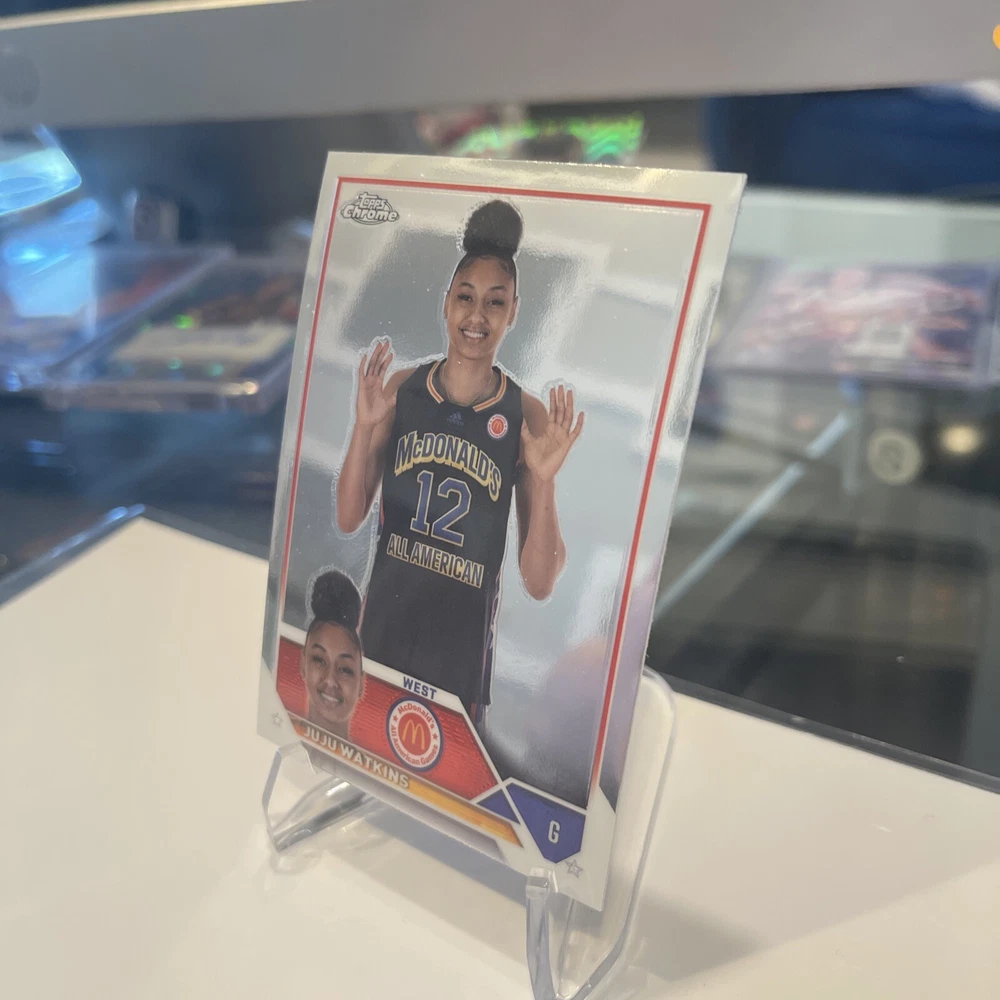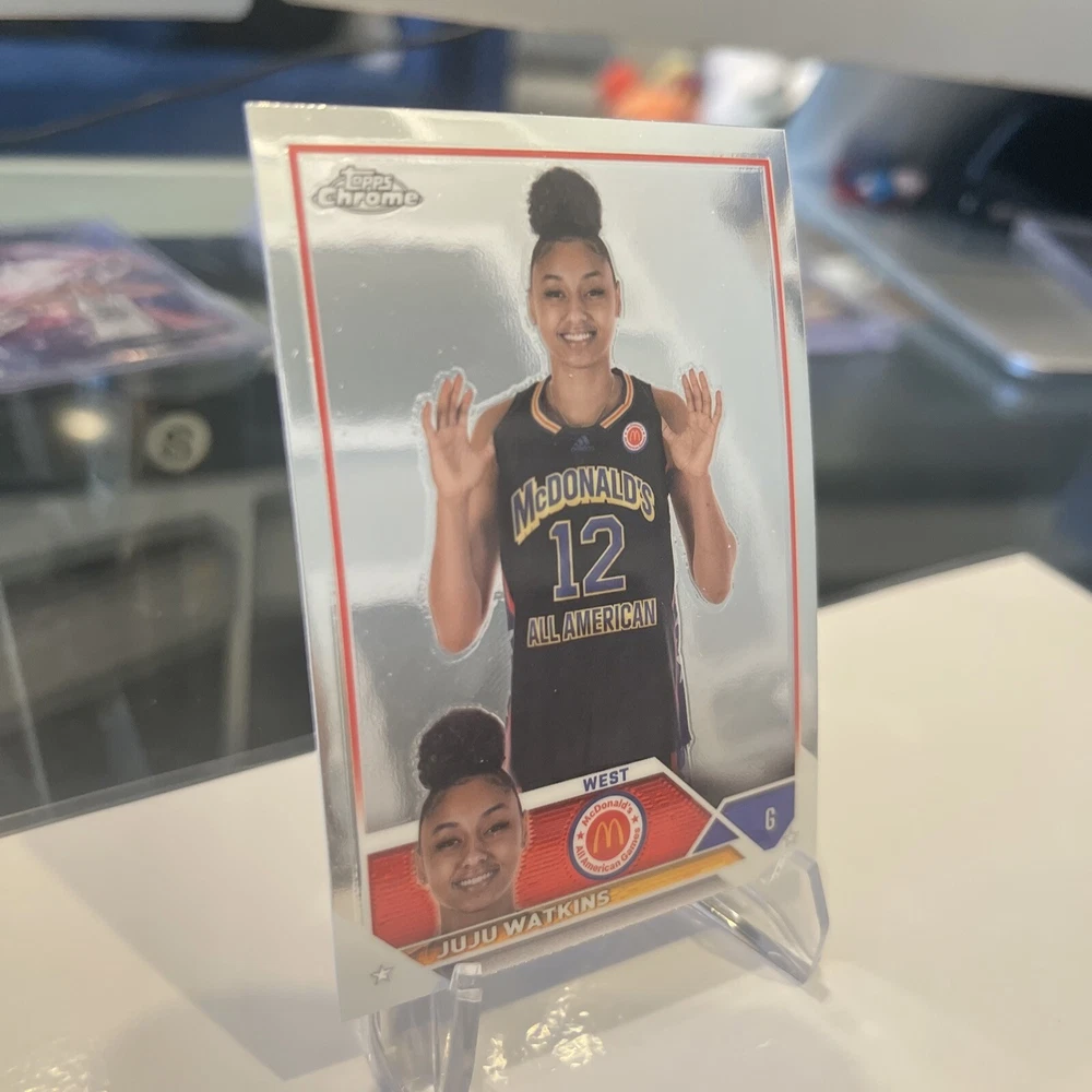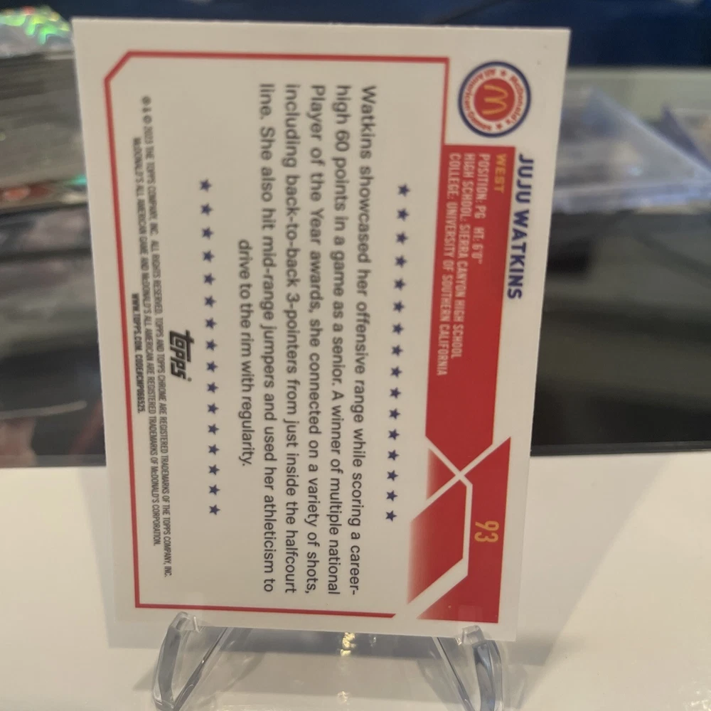 This JUJU WATKINS 2023 Topps Chrome McDonald's All-American #93 RC USC basketball trading card is a must-have for any collector or fan of the USC Trojans. With a near mint/mint item condition, this original rookie card features a chrome parallel/variety and is part of the 2023 Topps Chrome McDonald's All-American set. This single sports trading card has no autograph, but it is sure to impress with its high-quality card manufacturer, Topps Co. The card number is 93 and it has been manufactured in 2023. This card belongs to the modern period of 1970-now, making it a unique addition to any collection.