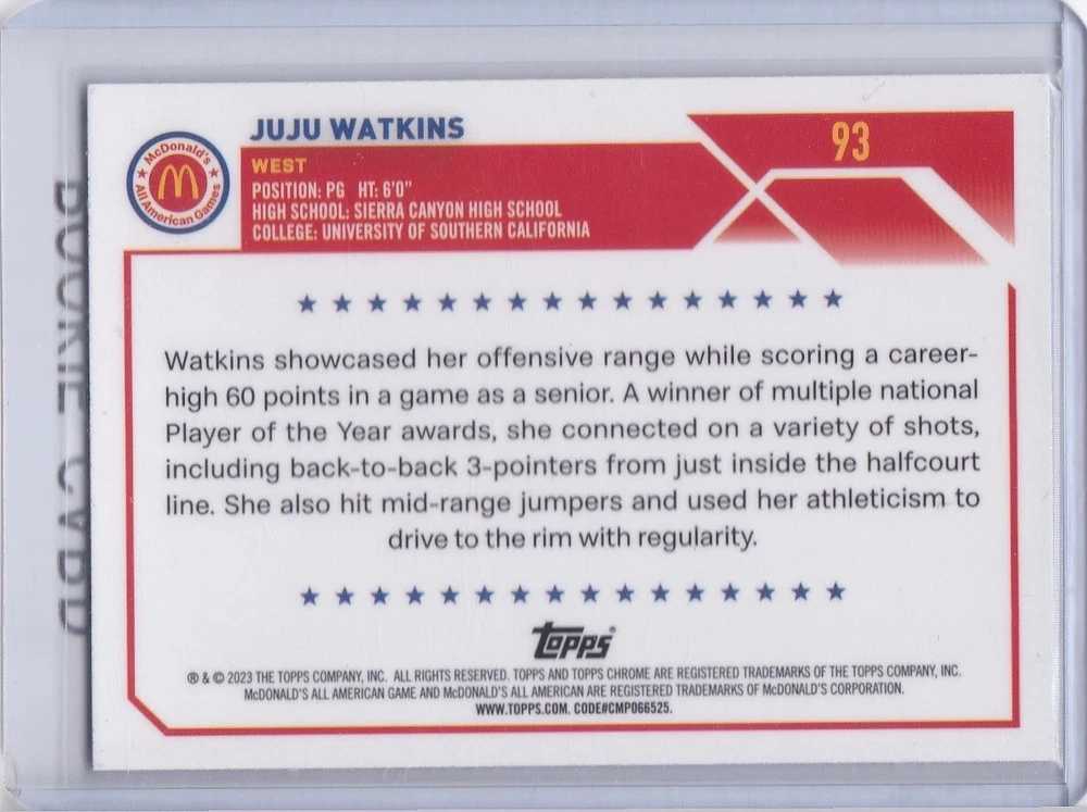 Yes- Shipping is Discounted on Multiple wins! S&H is $2.95 for 1st Item; $5.00 for 2 items or More (If you buy 2 or more cards shipping total is capped at $5 when paid all on the same invoice & won within a 48 Hr Period ~ Just wait, invoices will periodically update ~Thanks! (Worldwide shipping is also available, see below for all S&H details ) Item: 2023 Topps Chrome #93 Rookie card of WNBA Basketball Star Juju Watkins Condition: This card is in Nrmt-Mt condition Payments: Due within 3 days of auctions end by Paypal only, eBay will automatically send an unpaid item reminder dispute after 3 days. USA Shipping: on this item is $2.95. Discounted shipping is $5.00 flat rate for two or more items won with S&H within a 48 hour period and paid all on the same invoice. Invoices periodically update, usually atleast once a day. Worldwide shipping is available for $6.99 flat rate for all items won in a 48 hour period and paid on the same invoice. Invoices periodically update, usually atleast once a day. Policy: Customer Satisfaction is #1, if for any reason you are not 100% happy with your purchase contact me and I will fix any problems. Good Luck Bidding & please come back soon! I am always listing new items! Powered by SixBit's eCommerce Solution