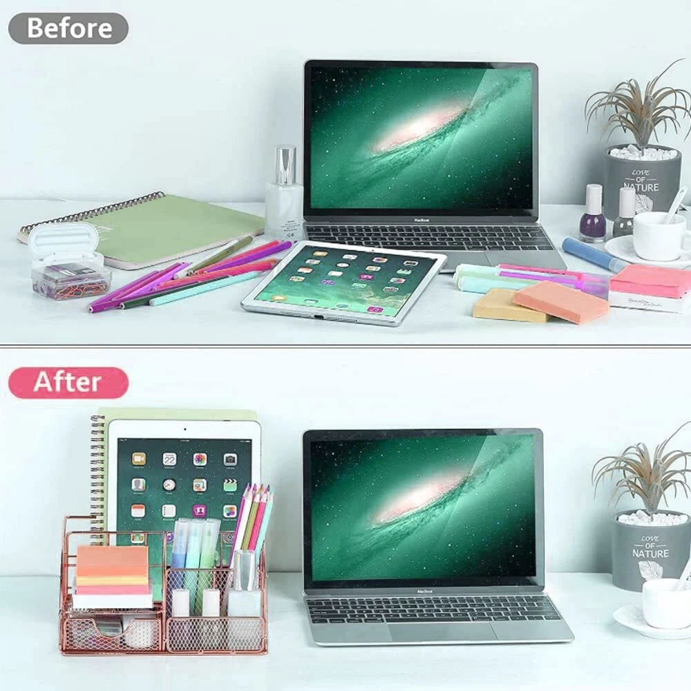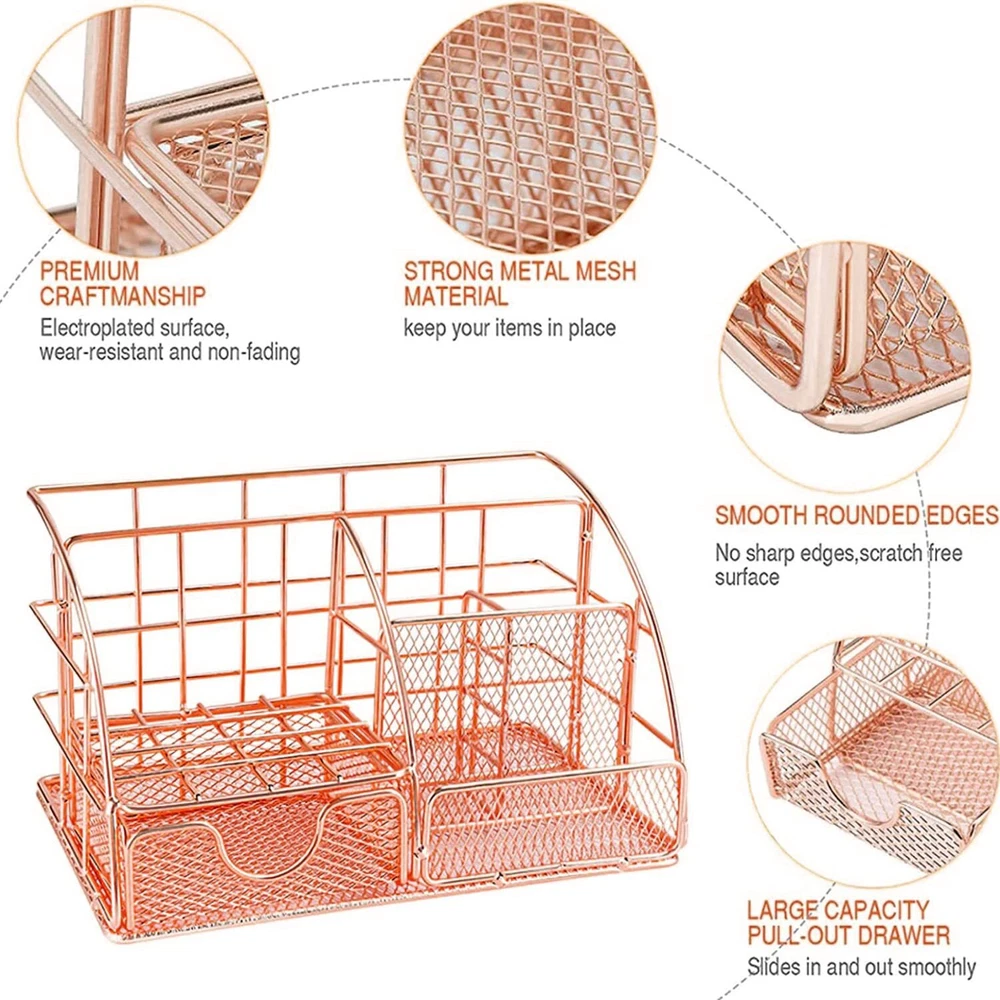 【Organizers and Accessories】You will get a set of delicate office organizers and supplies, including 12 pieces of office supplies set as shown in the main picture. If you want to add some classy touches on your workspace, the metal desk organizer and supplies fit the bill nicely. 【Larger Storage Space】Our desk organizer is larger than other similar designs on the market and has more storage space. The largest back compartment can easily hold up to 280 A4 sheets; The design of 6 compartments + 1 large drawer is completely enough for your daily office use. 【Space Saving for Desk】Desk organizers and storag is suitable for home, office, school etc, for you to place notebook, folders, pens, pencils and other office desk supplies or stationery, office organizers for desk also good for organizing. 【Premium Craftsmanship】The combination of barbed wire and wire craftsmanship, desk organizers adopting with a powder coat finish and electroplating technology, wear-resistant, slide proof. The rounded edges give your workspace a more refined look and ensure its safety. 【Excellent Customer Service】If you have any questions about our desk accessories & workspace organizers, please to contact us, we promise to reply to you within 24 hours with a satisfactory solution, you can buy with confidence.