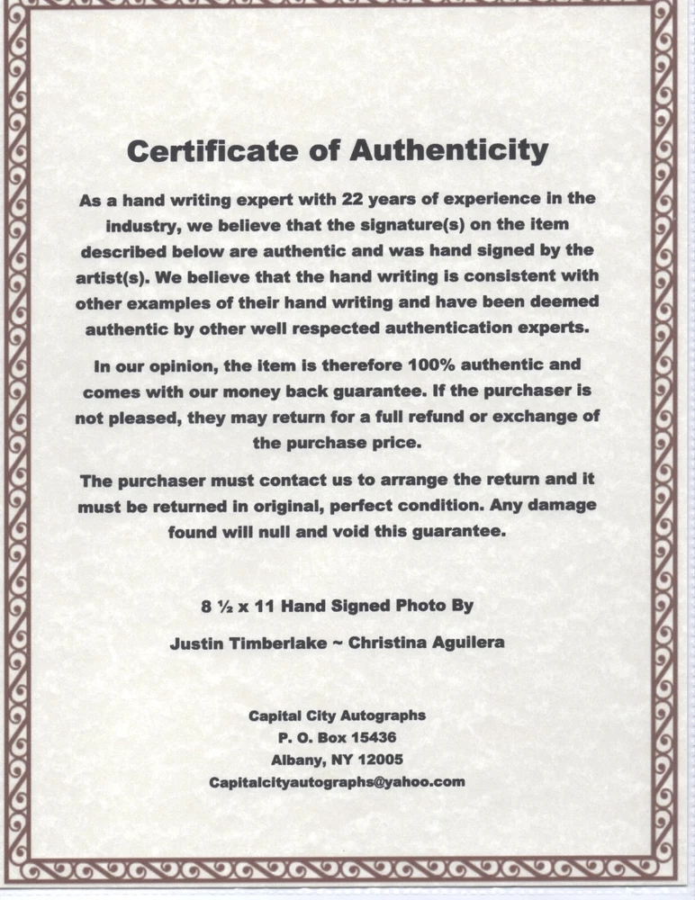 Offering a genuine hand signed 8 1/2 X 11 photo of JUSTIN TIMBERLAKE - CHRISTINA AGUILERA They had both signed in sharpies. This signed photo comes with the original COA that was received when it was purchased several years ago. Money back guarantee if it is not as described or if you are not pleased. Returns accepted with 30 days of purchase. Not a preprint or photocopy - guaranteed genuine I am listing a collection that is many years old and there might be some duplicates as the buyer collected everything he could find of his favorite celebrities. Also some of the COA companies may be out of business due to retiring. This does not void the COAs and we stand behind everything we sell. I will try to answer any questions. Thank you for looking at my offer.