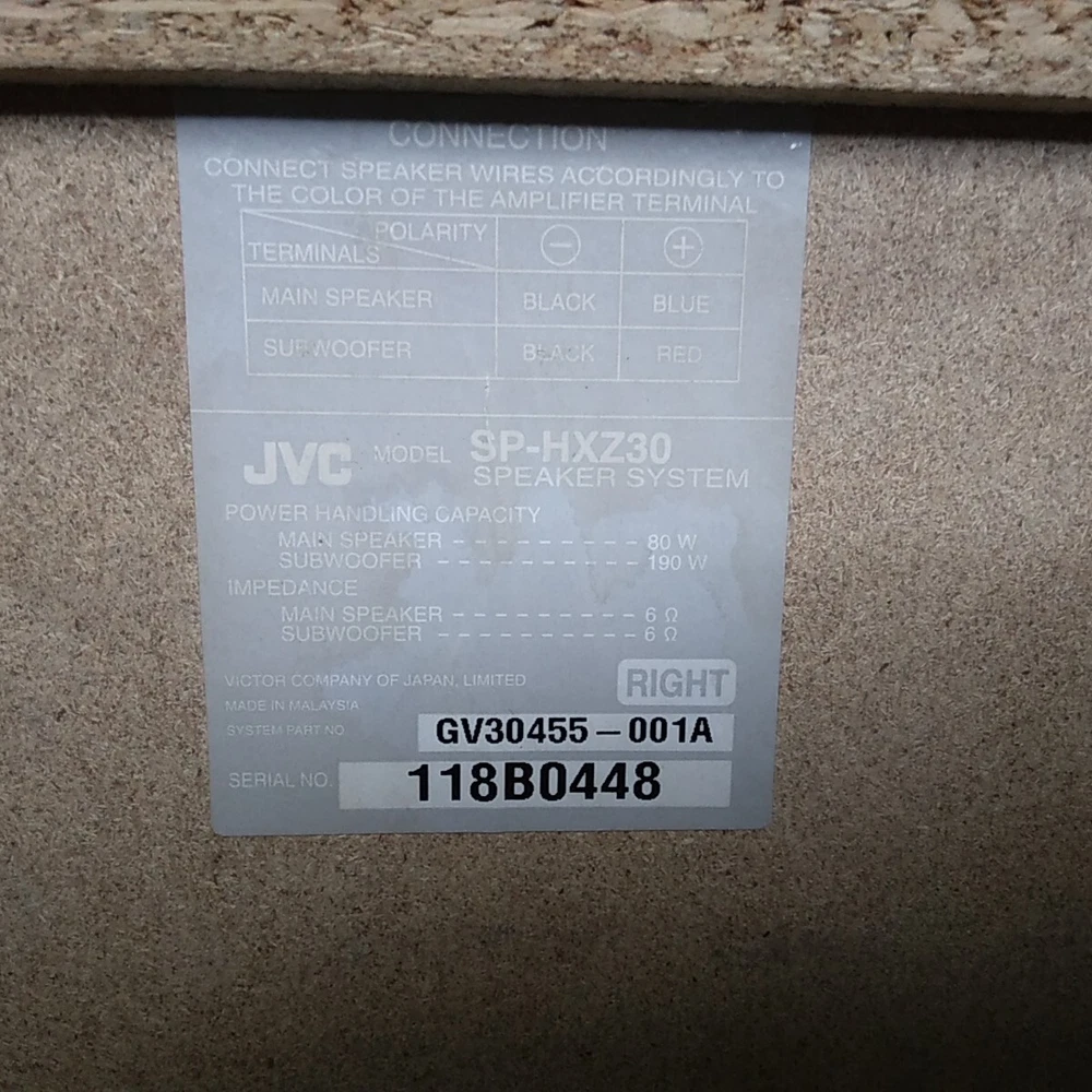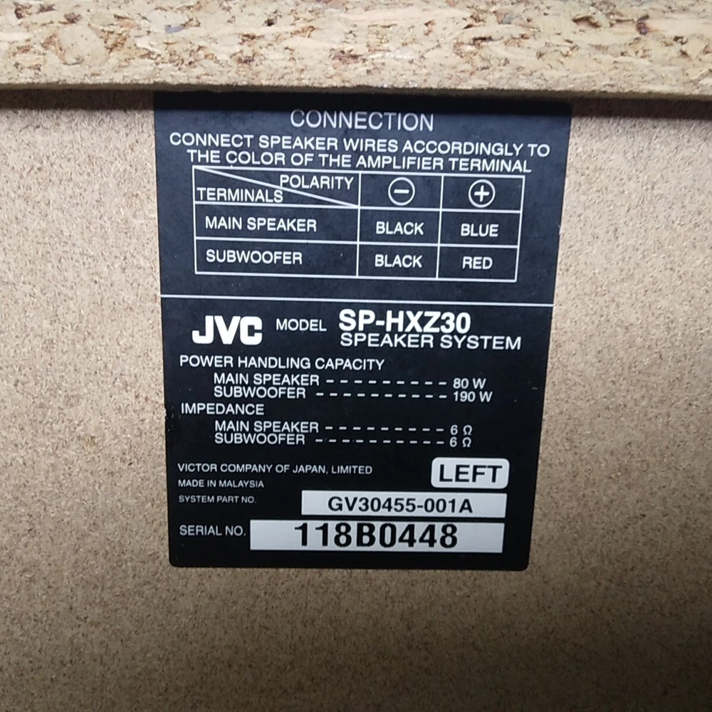 Left and right JVC SP-HXZ30 stereo speakers with built in subwoffer. Speakers only. These speakers have been tested with the JVC HC-Z30 system and work well. In decent cosmetic condition. Both have some scratches, dings, and scuffs. See pictures for a detailed look. These speakers will ship well protected. Thanks for the interest.