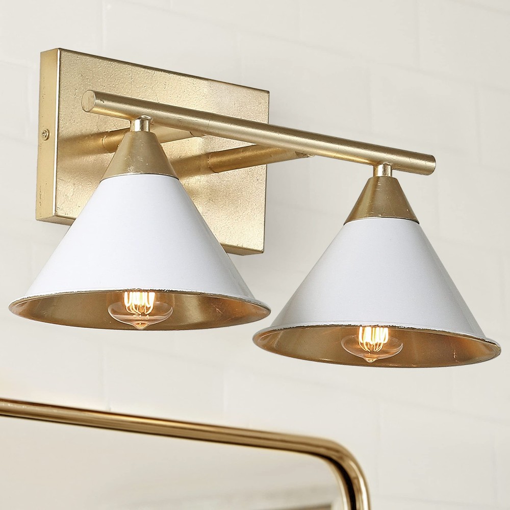 Perfect for above a mirror, this double light sconce or vanity lighting is a contemporary touch that would add style to a variety of spaces. White metal shades and gold leaf accents pair well for a modern update to your powder room or master bath. The plastic cord is easily connected to your home's electrical grid by a licensed electrician. QUALITY CONSTRUCTION: Wall light fixtures are used as general lighting; Available in amazing variety; Replacing old, outdated wall lights is a fast and affordable way to update your home design ENERGY-SAVING LED BULBS INCLUDED: LED bulbs are included with every light fixture; All of our lighting is ETL Listed and meets 120-volt UL standards for safety and quality; Professional installation is recommended for all wall light fixtures SATISFACTION GUARANTEED: Every design is created with uncompromising attention to detail, using only the highest quality components; Based in Soho, New York, designer Jonathan and his talented team create affordable high-end home decor Perfect for powder rooms or bathrooms, these sconces are best suited as vanity lighting Metal shades in white/gold