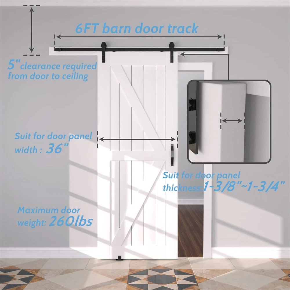 Basic Info: Barn door hardware kit maximum hold barn door for 265 lbs, Fit for door panel thickness from 1.375" to 1.75", Fit for door panel width up to 36"(door not included). Strong and Durable: Barn door track are made of high standard carbon steel with black powder coating, This greatly increases the robustness of the barn door track and makes it water, dust and rust resistant, all attributes that allow the entire barn door hardware kit to maintain long-term stable operation. Smooth and Quiet: Sliding door kit is based on the POM made wheels(2 bearings inside wheel), which allows the barn door system to slide more silky smoothly and quietly and does not easily cause wear and tear on the track. Less Space Ocuupy: Compared with normal sliding doors, barn doors and hardware included are more space-saving, the space behind your door is not bound, you can easily stack items behind the door, it is your space becomes more neat, this is the biggest reason why we choose barn door system. What Included: 5* barn door track(combine to 6ft), 2* barn door rollers, 2* door stoppers, 2* anti-jump pads, 1* floor guide, 1* maunal. Incase you get any confusion on installation or missing parts ,kindly contact us via amazon ,we may get back to you in 24 hours. "ONLY BARN DOOR HARDWARE KIT FOR SALE, BARN DOORS ARE NOT FOR SALE."