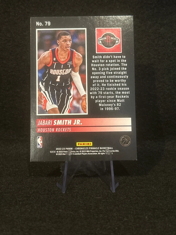 Capture a slice of basketball history with the Jabari Smith Jr. 2022-23 Panini Chronicles Pinnacle #79 rookie card. This collectible card showcases the promising talent of Jabari Smith Jr., captured in the iconic Pinnacle design that's a favorite among fans and collectors. As part of the base set from the renowned Panini Chronicles series, it's a must-have for anyone looking to complete their NBA card collection.The card represents not only a moment from Smith's rookie season but also a treasured piece of Houston Rockets memorabilia. With its crisp imagery and classic layout, it's a timeless tribute to the sport, the player, and the exciting 2022-23 NBA season. Whether you're a dedicated follower of Smith's career or a connoisseur of basketball trading cards, this item is sure to be a standout in your collection.