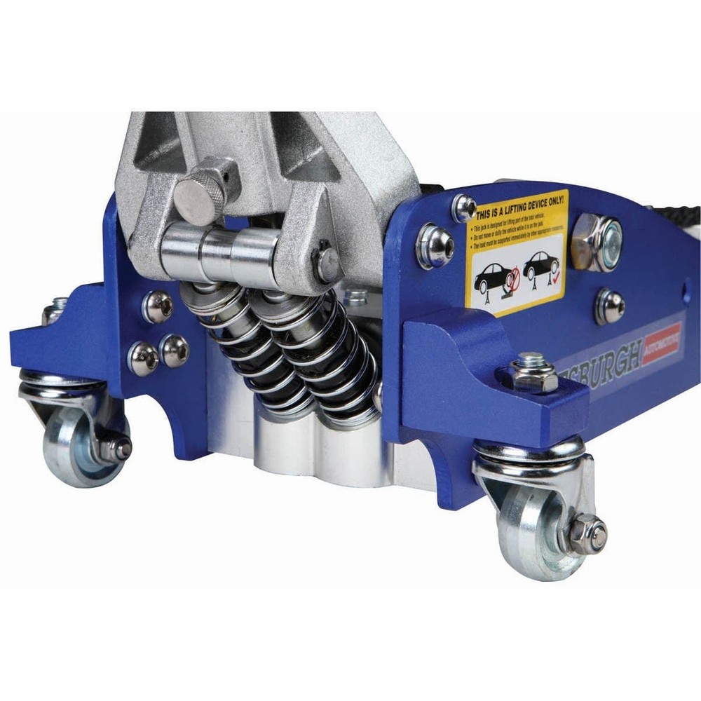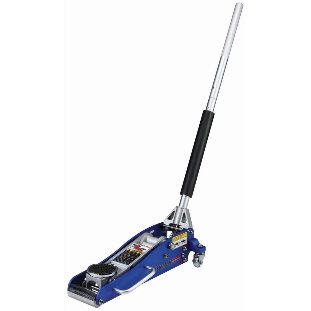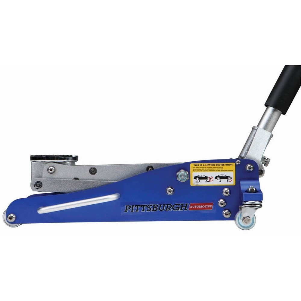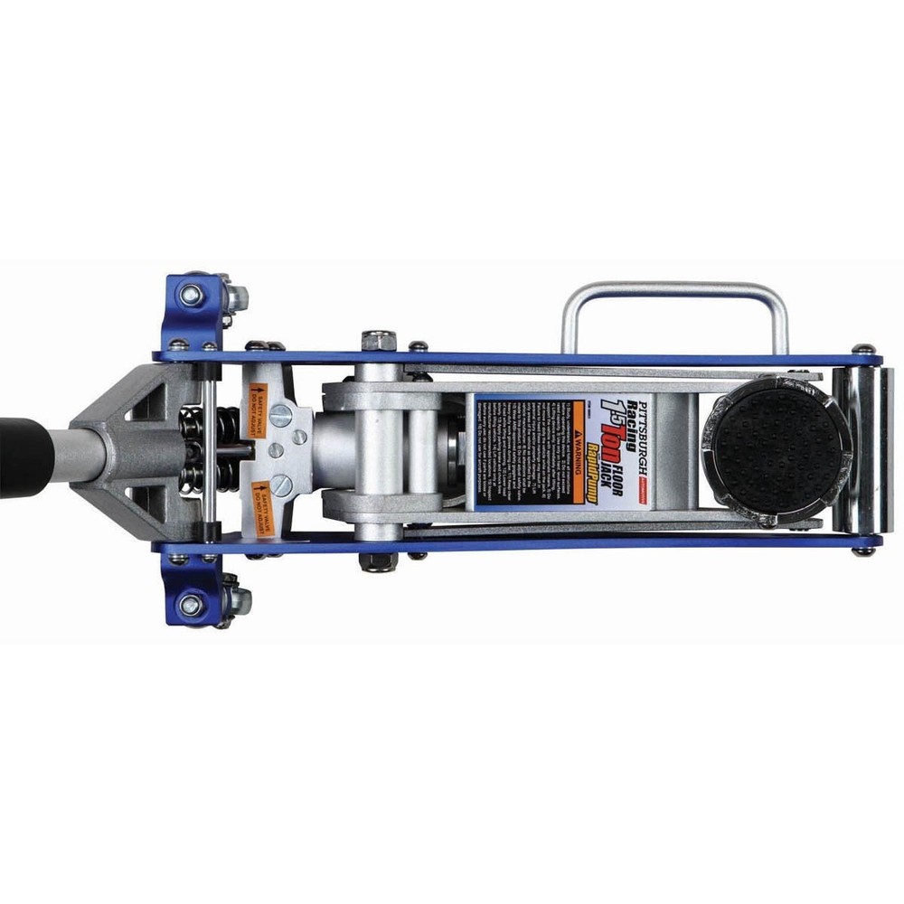 1.5 Ton Compact Aluminum Racing Floor Jack with Rapid Pump This compact racing jack is constructed with durable, aircraft aluminum billet. A knurled steel handle ensures a steady grip while you quickly lift your load in just 3-1/2 pumps! The racing jack also features a universal joint release mechanism for smooth, precision lowering and a compact design for easy storage and transport. Feature: - Pit crew quality design, machined from lightweight aircraft aluminum with a sapphire anodized finish - Industrial quality for professional mechanics and hardcore automotive enthusiasts - Rapid Pump exclusive dual parallel pump system lifts with far fewer pumps - Compact size for easy placement - Universal joint release provides precise load control in any handle position - Meets international quality standards - Two piece knurled steel handle for a sure grip, equipped with foam bumper to prevent damage to vehicle finish - Rubber saddle pad to prevent marring - Brand Pittsburgh Automotive - Handle Length (in.) 37-3/8 in. - Maximum Lift Height (in.) 14-1/8 in. - Minimum height (in.) 3-1/2 in. - Product Length 19 in. - Product Weight 34 lbs. - Product Width 9-1/2 in. - Shipping Weight 34.00 lb. - Size(s) 1.5 Ton This compact racing jack is constructed with durable, aircraft aluminum billet./ Industrial quality for professional mechanics and hardcore automotive enthusiasts A knurled steel handle ensures a steady grip while you quickly lift your load in just 3-1/2 pumps! The racing jack also features a universal joint release mechanism for smooth, precision lowering and a compact design for easy storage and transport. Pit crew quality design, machined from lightweight aircraft aluminum with a sapphire anodized finish Rapid Pump exclusive dual parallel pump system lifts with far fewer pumps./ Compact size for easy placement.