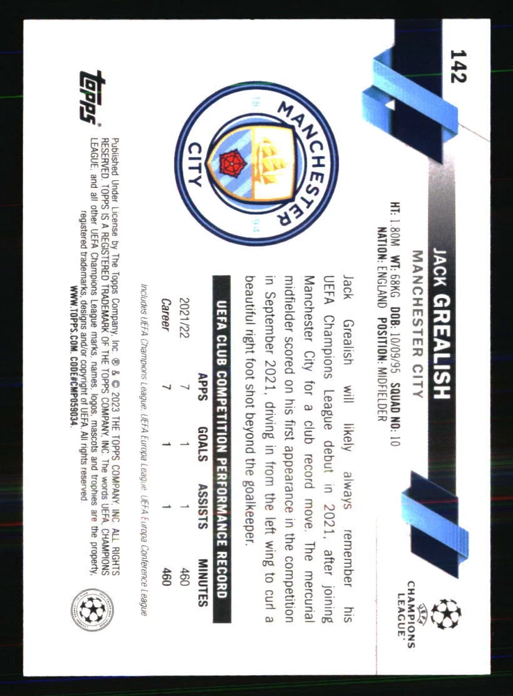 Sport: SOCCER Year Manufactured: 2022 Set: 2022-23 Topps UEFA Club Competitions 1st Edition Type: Sports Trading Card Team: Manchester City Graded: No Manufacturer: Topps Season: 2022 Autographed: No Card Number: 142 Player|Athlete: Jack Grealish