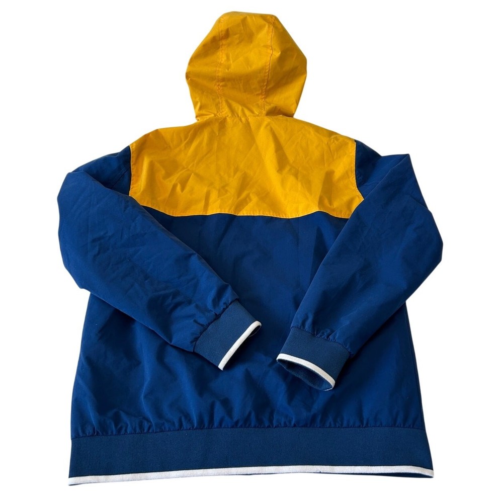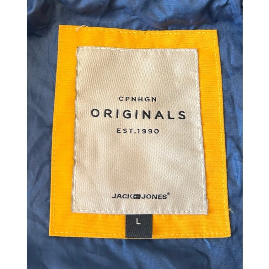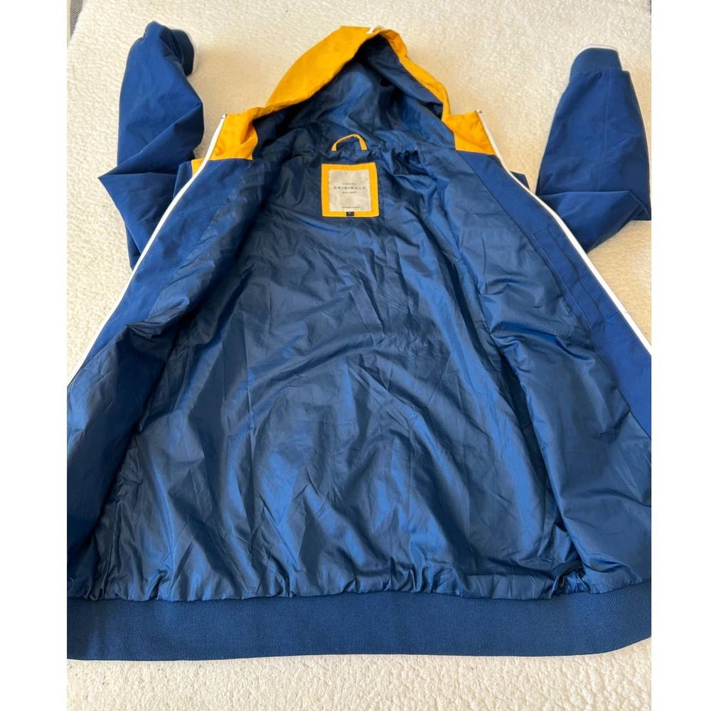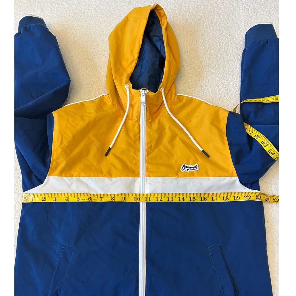 Stay protected from the elements with this awesome Jack & Jones Originals windbreaker! This full-zip hooded jacket features a cool multicolor design that's sure to turn heads. Perfect for those breezy days or light rain, this windbreaker is both practical and stylish. It is in great condition and ready for a new owner. Grab it now and add some flair to your wardrobe! Water Resistant Lightweight **Runs Small** No Tags with Material Content Pit to Pit- 21" Sleeve- 25" Length- 27.5"