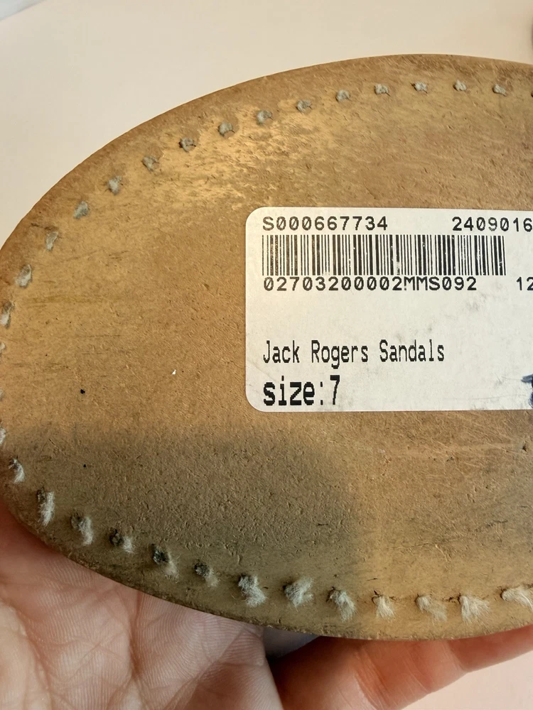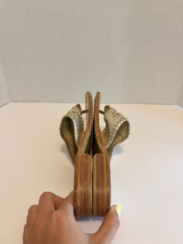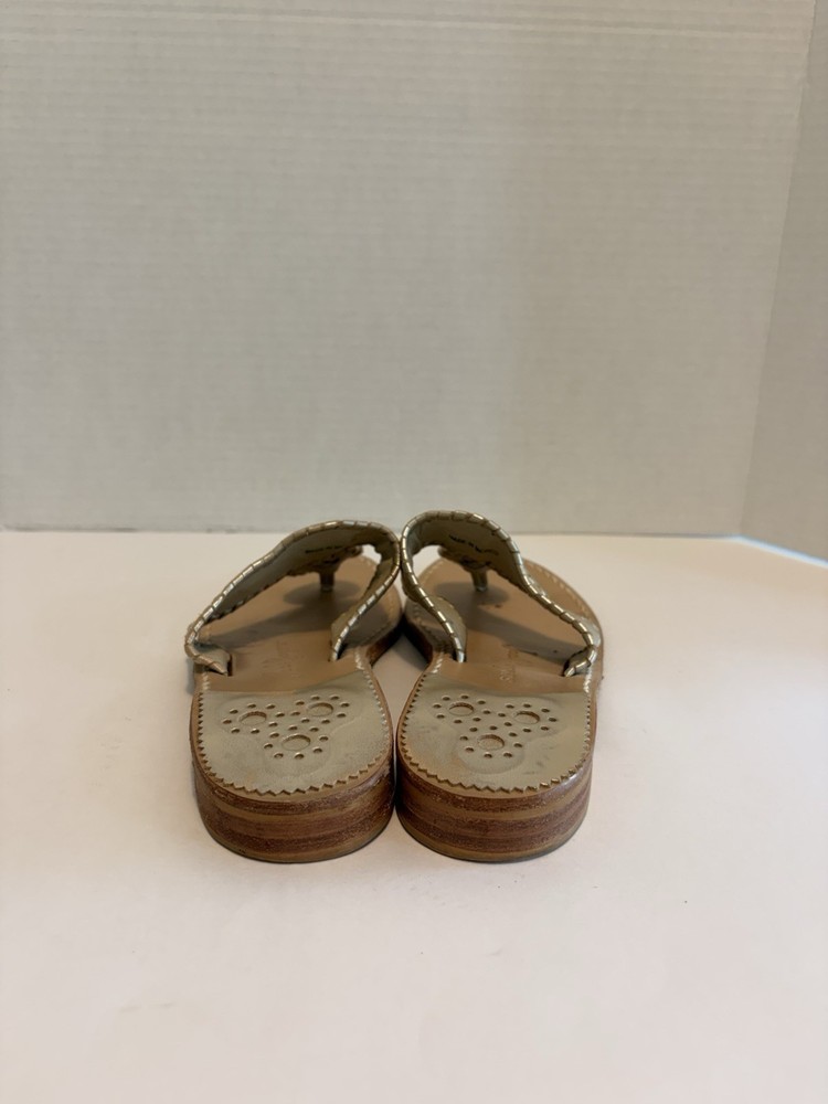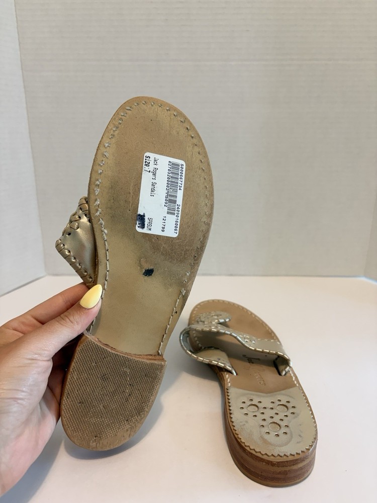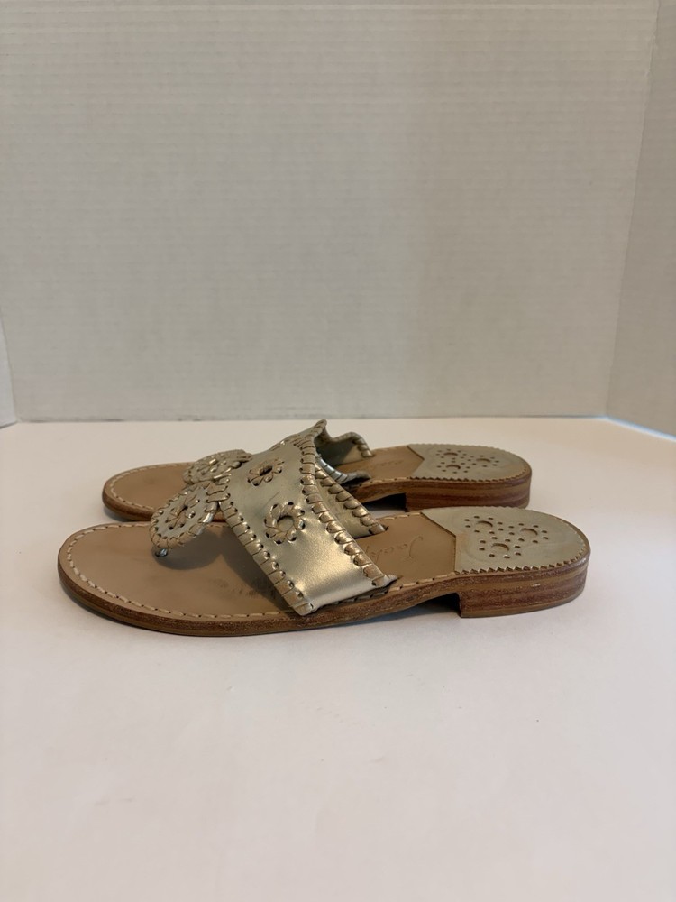 The product is a pair of Jack Rogers Original Jack gold leather flip flops for ladies in size 7. These stylish sandals feature a classic flip flop design with a luxurious gold color and leather upper material. Perfect for adding a touch of glam to any summer outfit, these sandals are a must-have for any fashion-forward woman looking for both style and comfort in their footwear. The Jack Rogers brand is known for its high-quality and timeless designs, making these flip flops a versatile and chic addition to any shoe collection.