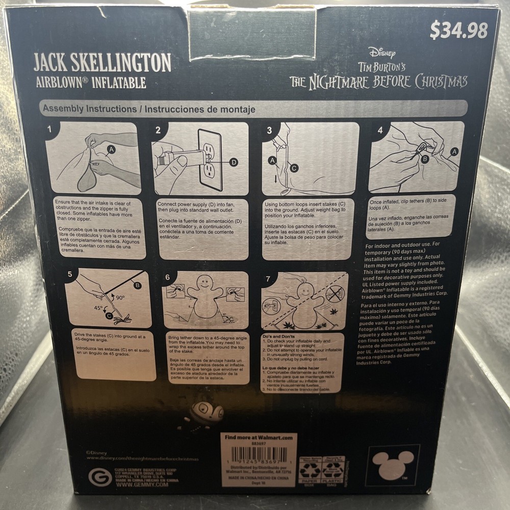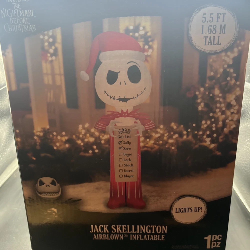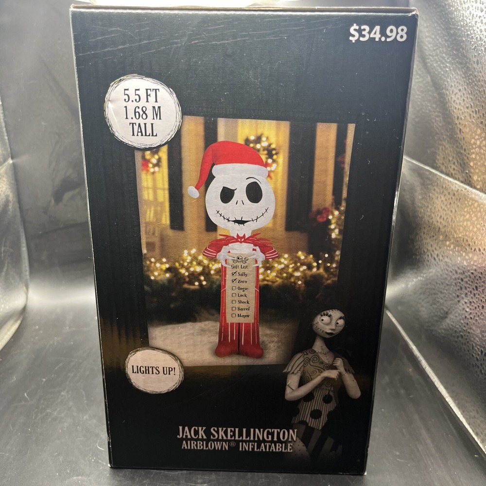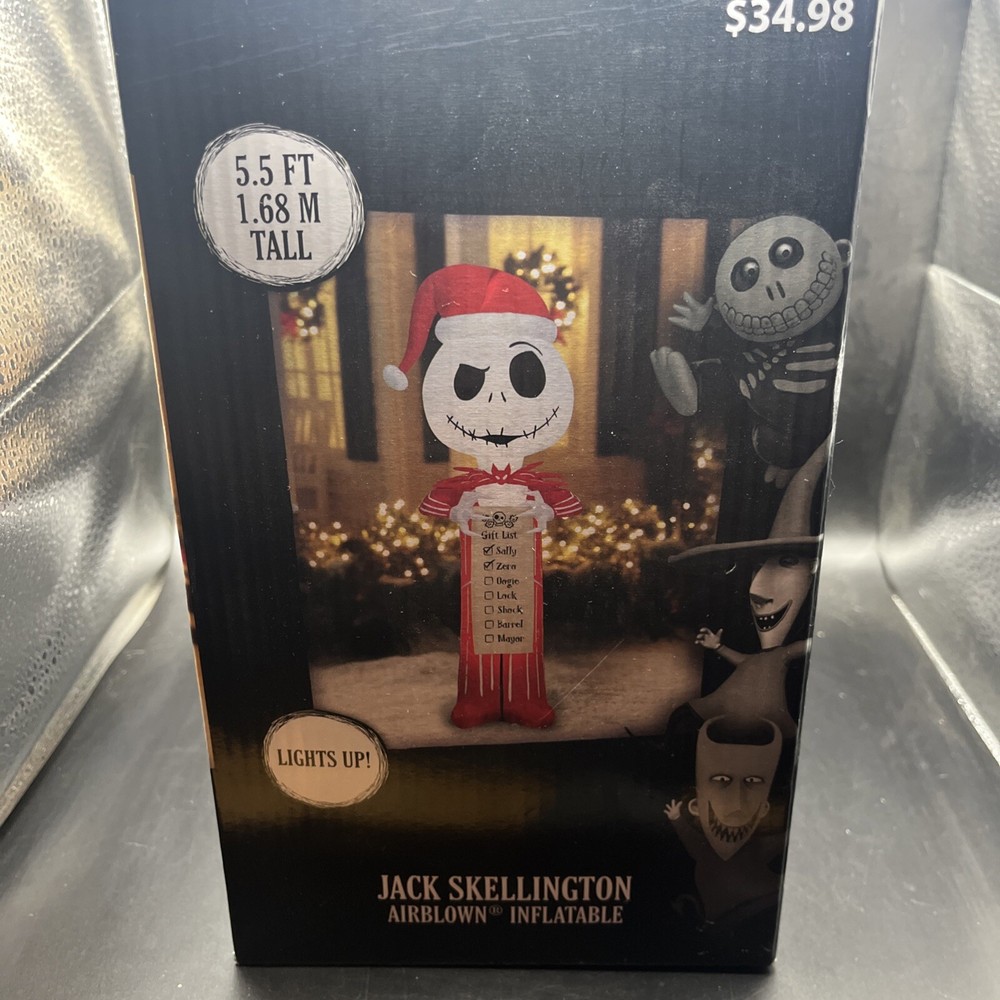 The Gemmy Christmas Inflatable features Jack Skellington holding a wish list, standing at a height of 5.5 ft. This multicolor inflatable decoration is ideal for adding a festive touch to your yard decor during the Christmas season.