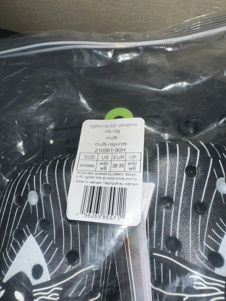 Country/Region of Manufacture: Vietnam Season: Fall, Spring, Summer, Winter Pattern: Striped Upper Material: Synthetic Closure: Slip On UK Shoe Size: 7 Vintage: No Occasion: Casual, Travel gtin13: 0196265855599 Model: Nightmare Before Christmas Department: Men Outsole Material: Synthetic Customized: No Color: Black Toe Shape: Round Toe EU Shoe Size: 43 Brand: Crocs Features: Ankle Strap, Comfort Type: Casual Shoe Width: Standard UPC: 0196265855599 Theme: Christmas, Halloween, Movie Lining Material: Synthetic US Shoe Size: 8 Character: Jack Skellington Insole Material: Synthetic Style: Clog
