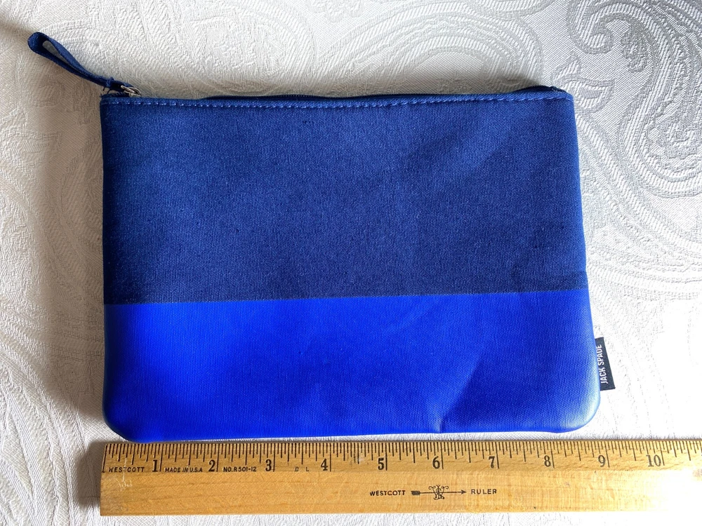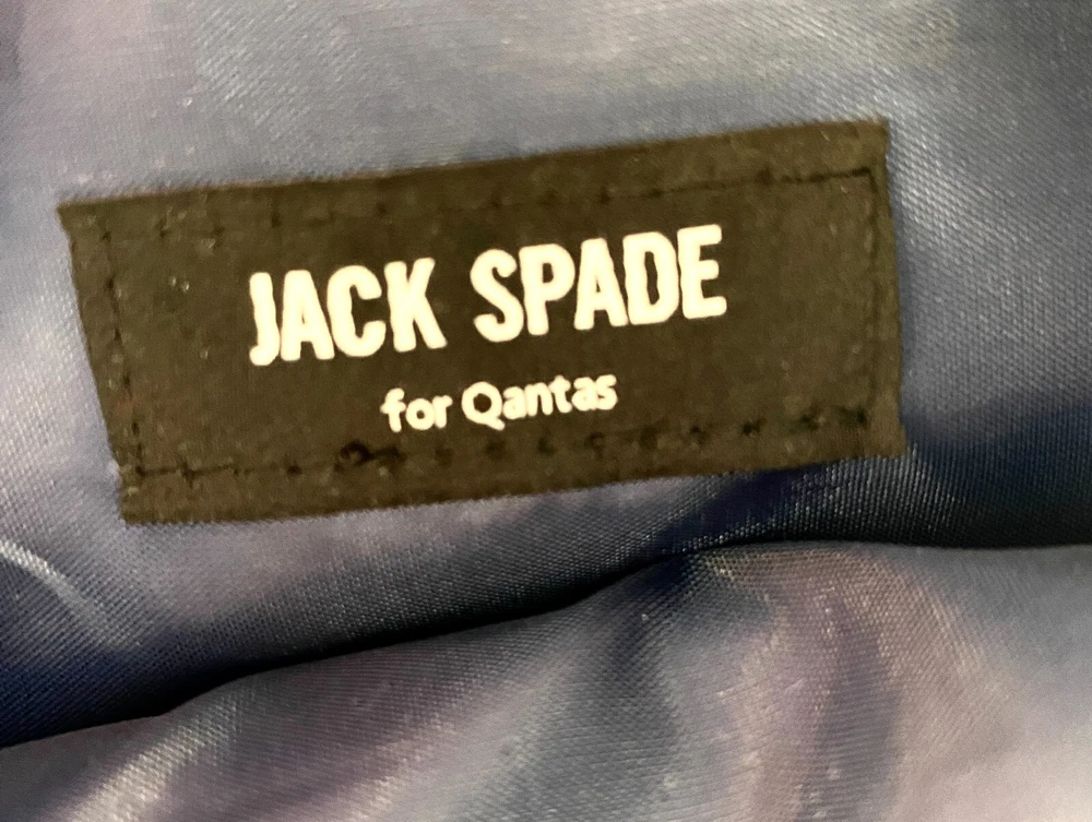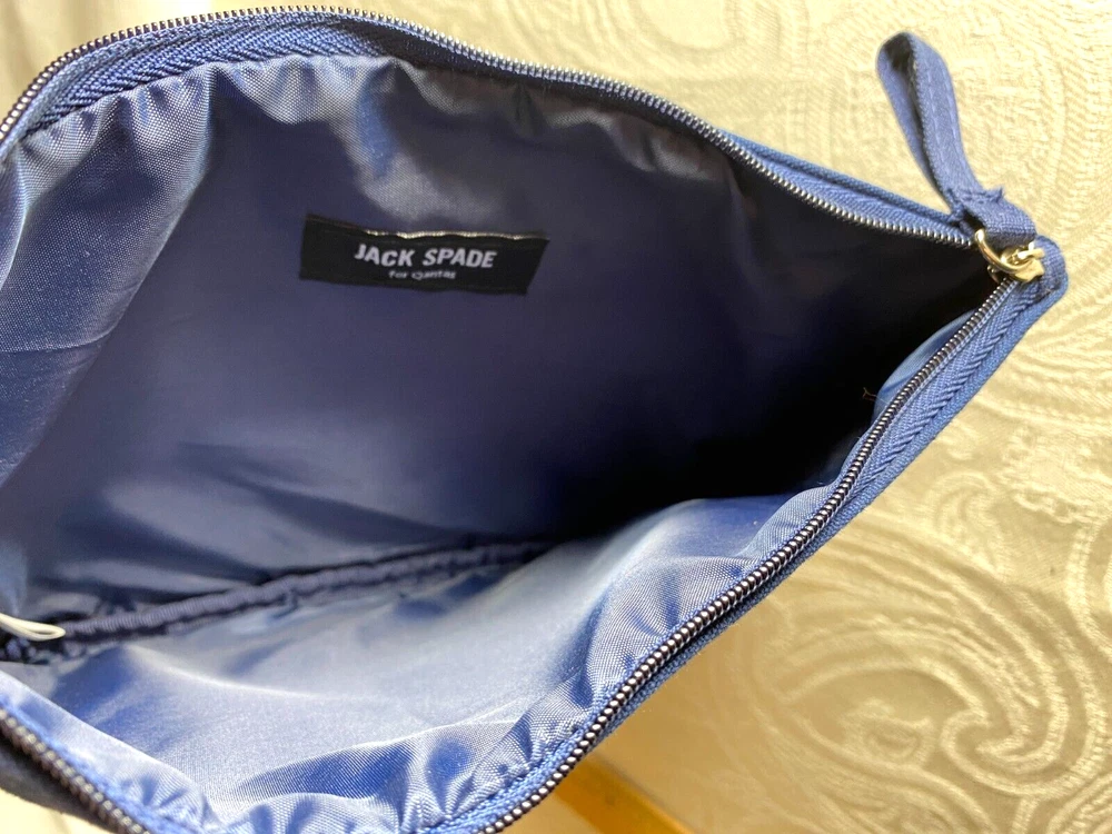 Jack Spade - New York for Quantas This is a zippered clutch toiletry bag in a canvas type fabric with a waterproof coating on the bottom, full lining, and it is lightly padded. It is a single pocket bag that measures approximately 9 inches x 6 inches x .5 inch. The sewn in label reads "JACK SPADE" and "NEW YORK". item weight = 1.8 ounces